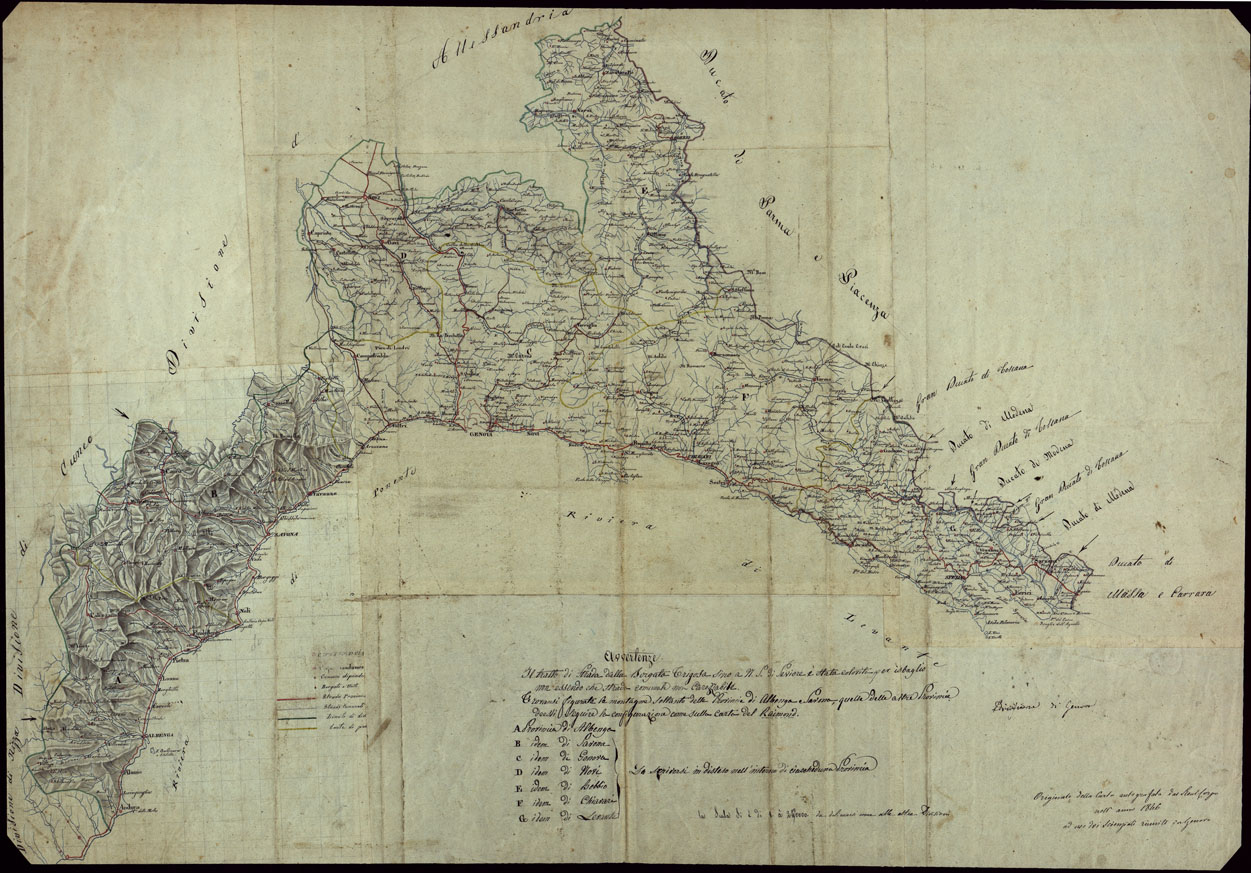 "Il titolo non è presente sulla carta. Disegno ad acquerello "originale della carta autografata dal Real Corpo nell'anno 1846 ad uso dei scienziati riuniti in Genova". Incompleto nell'orografia, soltanto in una parte del disegno rappresentata con lo sfumo a luce obliqua. Le strade sono distinte in provinciali (rosso) e comunali (nero). Le acque sono colorate in azzurro gli abitati in rosso i confini a varie tinte."