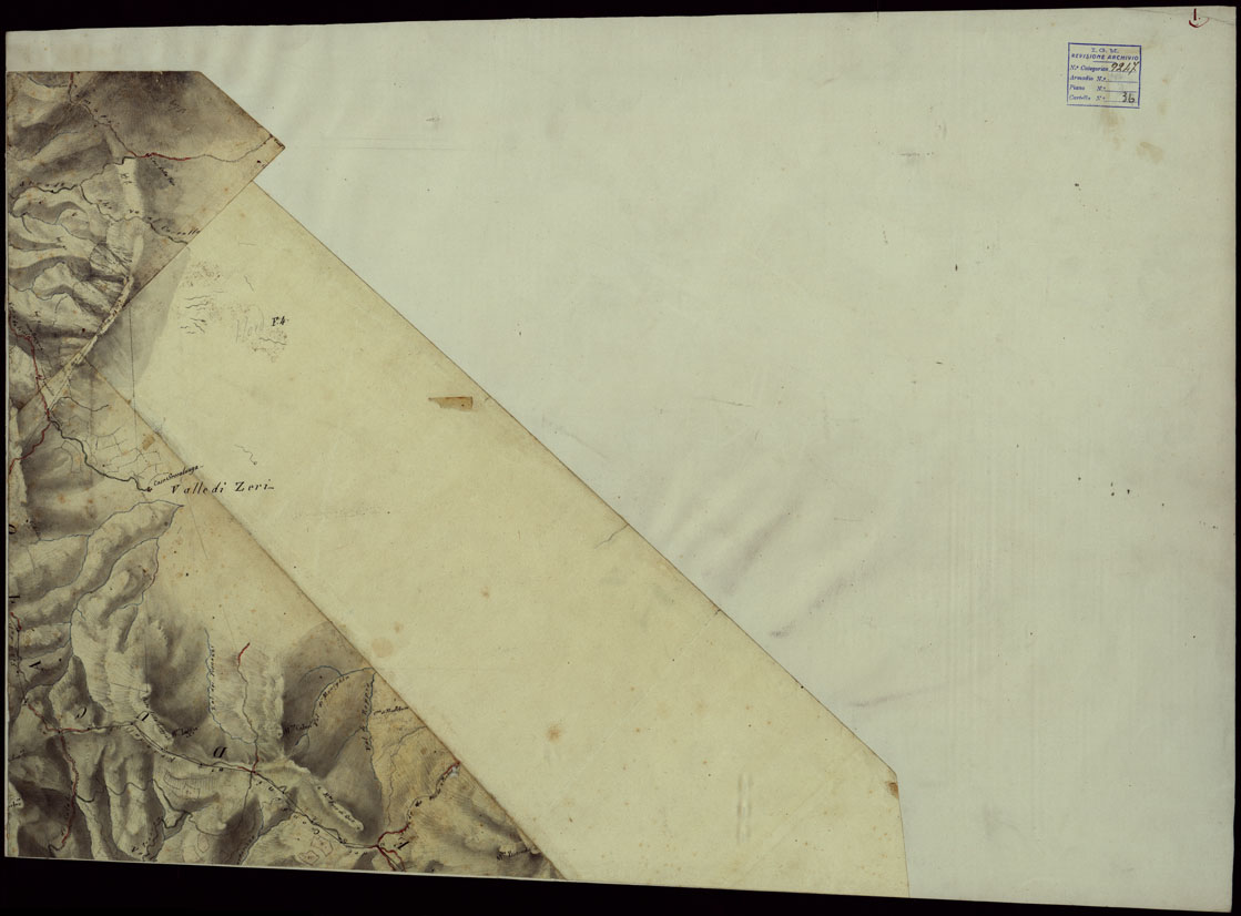 "Ventun fogli, e un quadro d'unione, disegnati ad acquerello, a luce obliqua, composti a mosaico e montati su tela. Una nota a lapis sul foglio 5, fa supporre si tratti di rilievi originali di campagna eseguiti dal 1815 al 1816. "
