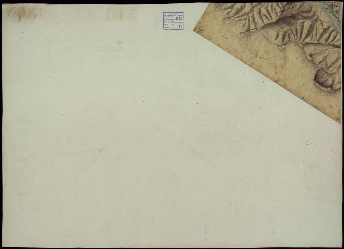 "Ventun fogli, e un quadro d'unione, disegnati ad acquerello, a luce obliqua, composti a mosaico e montati su tela. Una nota a lapis sul foglio 5, fa supporre si tratti di rilievi originali di campagna eseguiti dal 1815 al 1816."