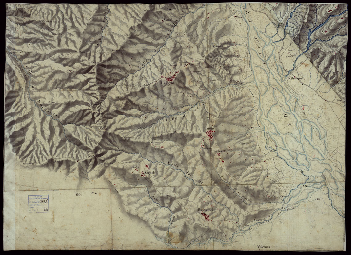 "Ventun fogli, e un quadro d'unione, disegnati ad acquerello, a luce obliqua, composti a mosaico e montati su tela. Una nota a lapis sul foglio 5, fa supporre si tratti di rilievi originali di campagna eseguiti dal 1815 al 1816."