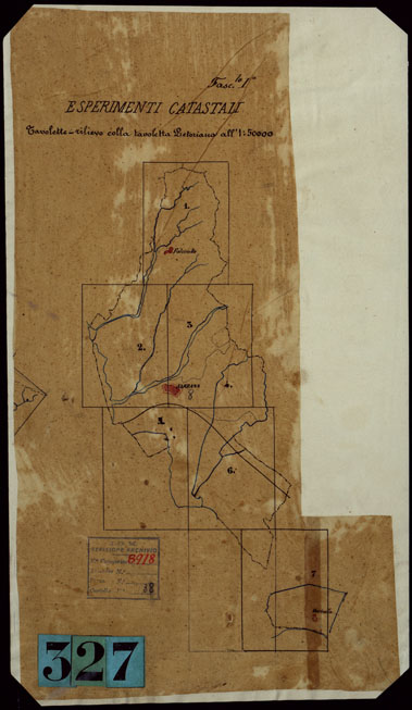"Docum. 327. Sette minute di campagna montate su tela. Allegato un piano della città di Sarzana alla scala di 1:10.000. Annesso un quadro d'unione al 50.000. Annessi ai documenti 323, 324, 325, 326, 327/8918 ci sono n° 13 volumi, contenenti quaderni di appunti, schizzi, delimitazioni territoriali, elenchi di coordinate, ecc., relativi alla costruzione delle carte, datati 1869-70."