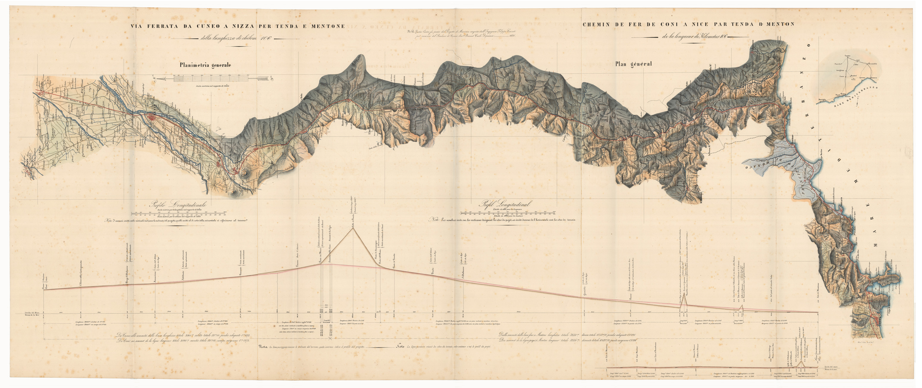 "Disegno ad acquerello con orografia a tratteggio sussidiato da sfumo a luce obliqua, idrografia in azzurro, abitati in rosso, rete stradale in tinta derivata dal giallo. Il tracciato della ferrovia è in rosso. La carta fa parte del " Progetto di massima eseguito dall'Ingegnere Filippo Cerroti per incarico del Sindaco di Cuneo Avv. Brunet Carlo Deputato, 1856". In basso il profilo longitudinale della ferrovia alle scale di 1:50.000 per le lunghezze e 1:10.000 per le altezze. Annessi 2 libretti corredati da disegni firmati dall'Ing. Filippo Cerroti, 1856."