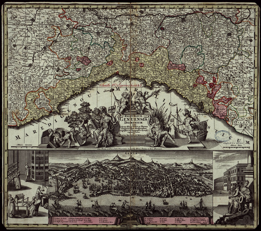 REPUBLICAE GENUENSIS DOMINIUM CUM INCLYTA ISTIUS URBIS ET PORTUS INSIGNIORIBUS PROSPECTIBUS GEOGRAPHICA ET TOPOGRAPHICA SYNOPSI REPRASENTATUM PER MATTH. L. SEUTTER S. C. M. GEOGR. AUG.