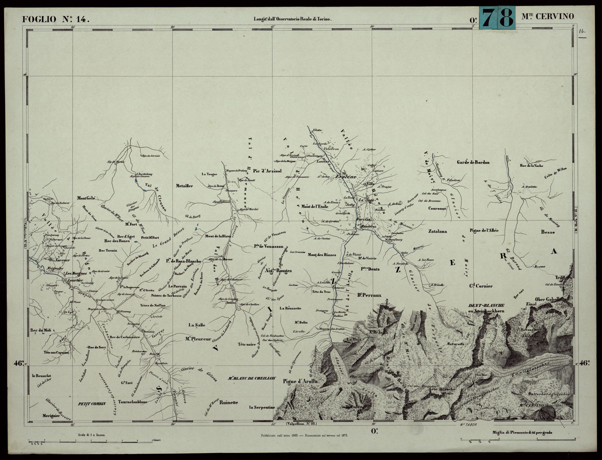 CARTA TOPOGRAFICA DEGLI STATI IN TERRAFERMA DI S.M. IL RE DI SARDEGNA ALLA SCALA DI 1.A 50.000. OPERA DEL CORPO REALE DELLO STATO MAGGIORE - FOGLIO N.°14. MONTE CERVINO + DOCUMENTO DI AGGIORNAMENTO