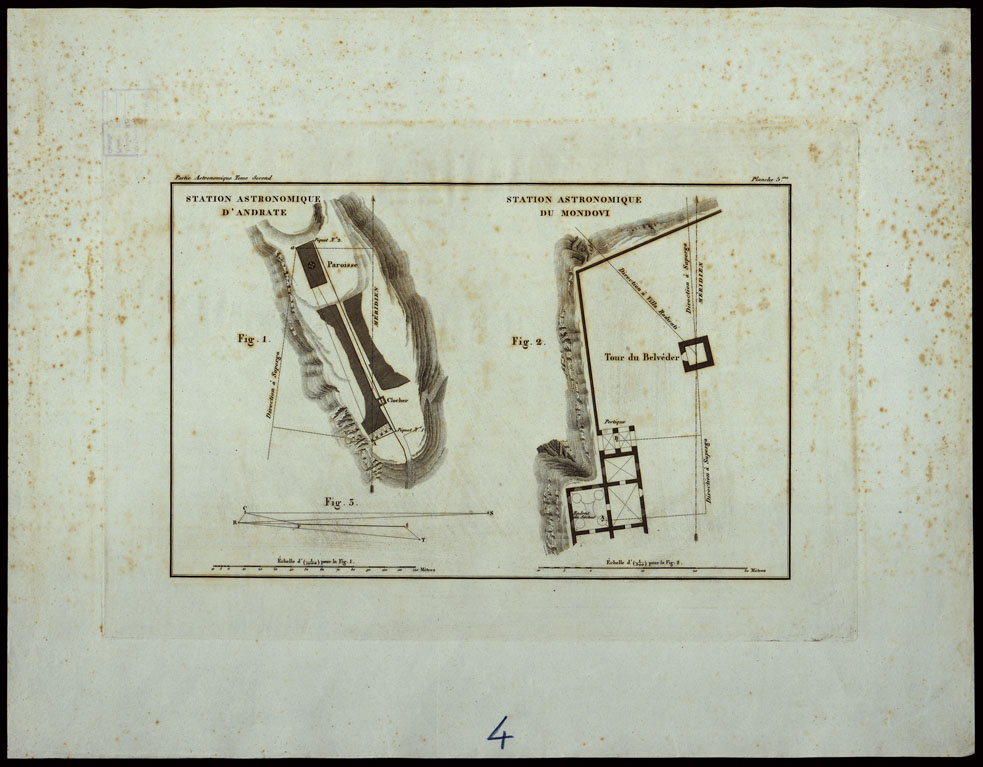 "Gruppo di otto tavole riferentisi ai lavori trigonometrici eseguiti per l'allacciamento della rete di Francia con quella d'Italia. Due copie di ognuna delle due carte già descritte al N° 63 e 64 d'ordine (N°2 e 3 della Coll. Pasqui) Ligne des signaux de Feu pour la dèterminaton des diffèrences de longitude (scala 1:2000000, tre copie) Réseau trigonometrique en Piemont et en Lombardie servant à la vérification du degré du méridien de Turin et à la comparaison des bases de France avec celle mesurée près du Tesin (scala 1:500000) Station astronomique d'Andrate (1:10000). Station Astronomique du Mondovì (1:300) Plans des Observatoires du Mont-Cénis et du Mont Colombier (due copie) Triangulation faite aux environs de Turin (1:75000, due copie) Signaux Trigonometriques."