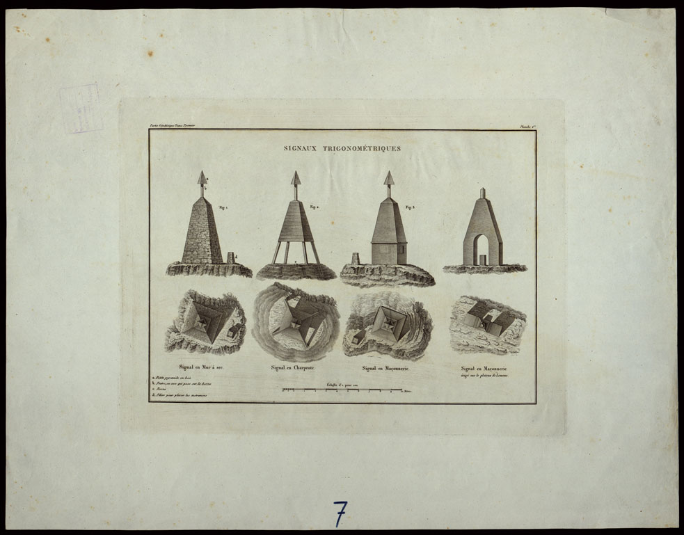 "Gruppo di otto tavole riferentisi ai lavori trigonometrici eseguiti per l'allacciamento della rete di Francia con quella d'Italia. Due copie di ognuna delle due carte già descritte al N° 63 e 64 d'ordine (N°2 e 3 della Coll. Pasqui) Ligne des signaux de Feu pour la dèterminaton des diffèrences de longitude (scala 1:2000000, tre copie) Réseau trigonometrique en Piemont et en Lombardie servant à la vérification du degré du méridien de Turin et à la comparaison des bases de France avec celle mesurée près du Tesin (scala 1:500000) Station astronomique d'Andrate (1:10000). Station Astronomique du Mondovì (1:300) Plans des Observatoires du Mont-Cénis et du Mont Colombier (due copie) Triangulation faite aux environs de Turin (1:75000, due copie) Signaux Trigonometriques."