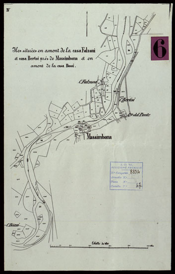 "Disegno su tela lucida. Due copie a colori e una terza in nero in sei piccoli fogli. Un secondo lucido su tela,pure a colori, si riferisce al tratto del Mincio tra Rivalta e C. Pardinali(Mantova). E' alla stessa scala e misura cm. 62x63."