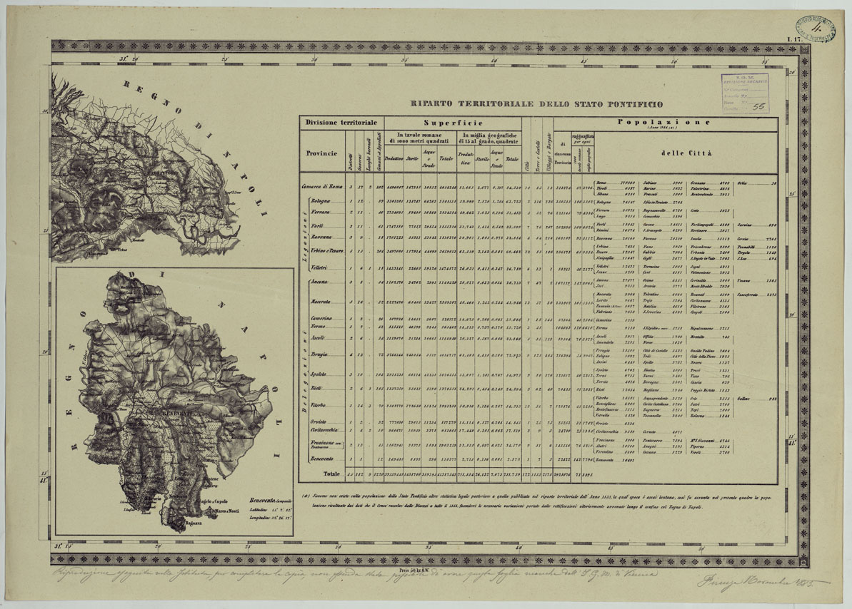 CARTA TOPOGRAFICA DELLO STATO PONTIFICIO E DAL GRAN-DUCATO DI TOSCANA COSTRUTTA SOPRA MISURE ASTRONOMICO TRIGONOMETRICHE CHE ED INCISA SOPRA PIETRA A VIENNA NELL'I.R. ISTITUTO GEOGRAFICO MILITARE PUBBLICATA NELL'ANNO 1851 - FOG. I.17