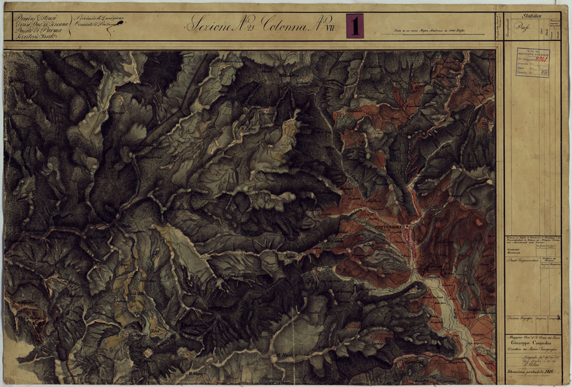 "Sono quarantacinque fogli rilevati sul terreno sotta la direzione del Magg. Carandini del Genio Modenese dal 1821 al 1828. Ad acquarello, con orografia rappresentata mediante tratteggio a luce zenitale, centri abitati e strade principali in rosso, idrografia in azzurro. A destra di ciascun foglio una colonna preparata per i dati statistici, le posizioni geografiche, ecc. in basso le firme degli ufficiali che attesero al lavoro. La carta venne incisa su rame nel 1828 dal R.I. Geogr. Milit. Austriaco in Milano e servì per la riproduzione e il disegno della carta alla scala di 1:86.400 (ved. N° 10 d'ordine. Cart. d'Arch. N° 54, Docum. N°7 e 8). Alla carta è annesso un quadro d'unione. (Cnfr: Mori A., La cartografia ufficiale, ecc.,pagg. 55-56). Due copie una delle quali incompleta: Docum. N° 8942. Una riduzione al 100.000 si compone di 10 fogli disegnati a colori - Docum. N° 8943)"