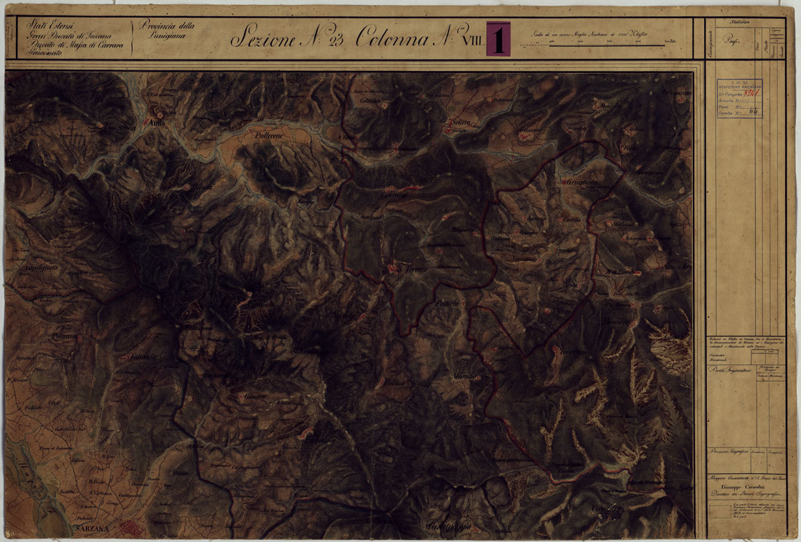 "Sono quarantacinque fogli rilevati sul terreno sotta la direzione del Magg. Carandini del Genio Modenese dal 1821 al 1828. Ad acquarello, con orografia rappresentata mediante tratteggio a luce zenitale, centri abitati e strade principali in rosso, idrografia in azzurro. A destra di ciascun foglio una colonna preparata per i dati statistici, le posizioni geografiche, ecc. in basso le firme degli ufficiali che attesero al lavoro. La carta venne incisa su rame nel 1828 dal R.I. Geogr. Milit. Austriaco in Milano e servì per la riproduzione e il disegno della carta alla scala di 1:86.400 (ved. N° 10 d'ordine. Cart. d'Arch. N° 54, Docum. N°7 e 8). Alla carta è annesso un quadro d'unione. (Cnfr: Mori A., La cartografia ufficiale, ecc.,pagg. 55-56). Due copie una delle quali incompleta: Docum. N° 8942. Una riduzione al 100.000 si compone di 10 fogli disegnati a colori - Docum. N° 8943)"