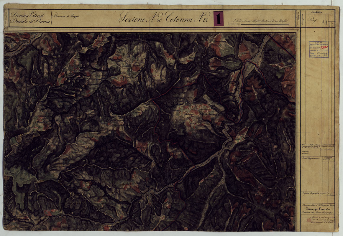 "Sono quarantacinque fogli rilevati sul terreno sotto la direzione del Magg. Carandini del Genio Modenese dal 1821 al 1828. Ad acquerello, con orografia rappresentata mediante tratteggio a luce zenitale, centri abitati e strade principali in rosso, idrografia in azzurro. A destra di ciascun foglio una colonna preparata per i dati statistici, le posizioni geografiche, ecc. in basso le firme degli ufficiali che attesero al lavoro. La carta venne incisa su rame nel 1828 dal R. I. Geogr. Milit. Austriaco in Milano e servì per la riproduzione e il disegno della carta alla scala di 1:86.400 (ved. N°10 d'ordine. Cart. d'Arch. N° 54, Docum. N°7 e 8). Alla carta è annesso un quadro d'unione. (Cnfr. Mori A., La cartografia ufficiale, ecc., pagg. 55-56). Due copie una delle quali incompleta: Docum. N° 8942. Una riduzione al 100.000 si compone di dieci fogli disegnati a colori. - Docum. N°8943). Nella Sezione 16 colonna XIII e nella Sezione 17 colonna XIII sono presenti dei fuori margine."