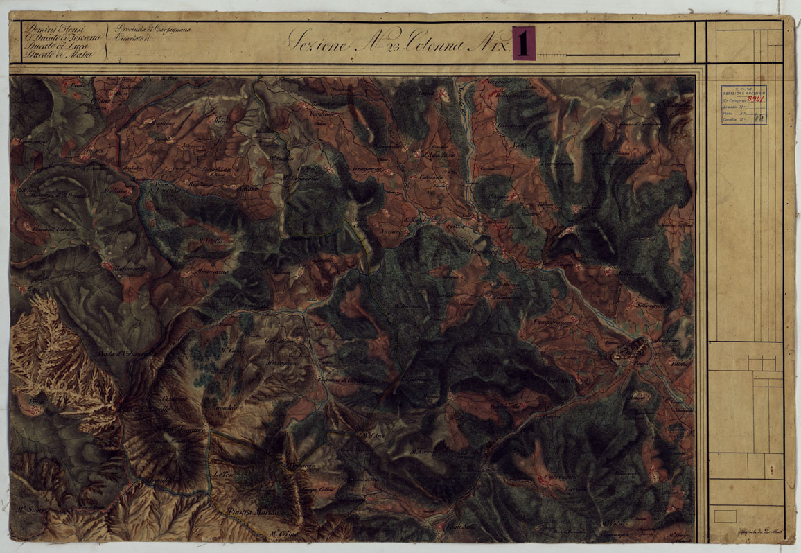 "Sono quarantacinque fogli rilevati sul terreno sotto la direzione del Magg. Carandini del Genio Modenese dal 1821 al 1828. Ad acquerello, con orografia rappresentata mediante tratteggio a luce zenitale, centri abitati e strade principali in rosso, idrografia in azzurro. A destra di ciascun foglio una colonna preparata per i dati statistici, le posizioni geografiche, ecc. in basso le firme degli ufficiali che attesero al lavoro. La carta venne incisa su rame nel 1828 dal R. I. Geogr. Milit. Austriaco in Milano e servì per la riproduzione e il disegno della carta alla scala di 1:86.400 (ved. N°10 d'ordine. Cart. d'Arch. N° 54, Docum. N°7 e 8). Alla carta è annesso un quadro d'unione. (Cnfr. Mori A., La cartografia ufficiale, ecc., pagg. 55-56). Due copie una delle quali incompleta: Docum. N° 8942. Una riduzione al 100.000 si compone di dieci fogli disegnati a colori. - Docum. N°8943). Nella Sezione 16 colonna XIII e nella Sezione 17 colonna XIII ) sono presenti dei fuori margine."