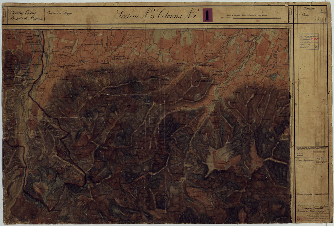"Sono quarantacinque fogli rilevati sul terreno sotto la direzione del Magg. Carandini del Genio Modenese dal 1821 al 1828. Ad acquerello, con orografia rappresentata mediante tratteggio a luce zenitale, centri abitati e strade principali in rosso, idrografia in azzurro. A destra di ciascun foglio una colonna preparata per i dati statistici, le posizioni geografiche, ecc. in basso le firme degli ufficiali che attesero al lavoro. La carta venne incisa su rame nel 1828 dal R. I. Geogr. Milit. Austriaco in Milano e servì per la riproduzione e il disegno della carta alla scala di 1:86.400 (ved. N°10 d'ordine. Cart. d'Arch. N° 54, Docum. N°7 e 8). Alla carta è annesso un quadro d'unione. (Cnfr. Mori A., La cartografia ufficiale, ecc., pagg. 55-56). Due copie una delle quali incompleta: Docum. N° 8942. Una riduzione al 100.000 si compone di dieci fogli disegnati a colori. - Docum. N°8943). Nella Sezione 16 colonna XIII e nella Sezione 17 colonna XIII sono presenti dei fuori margine."