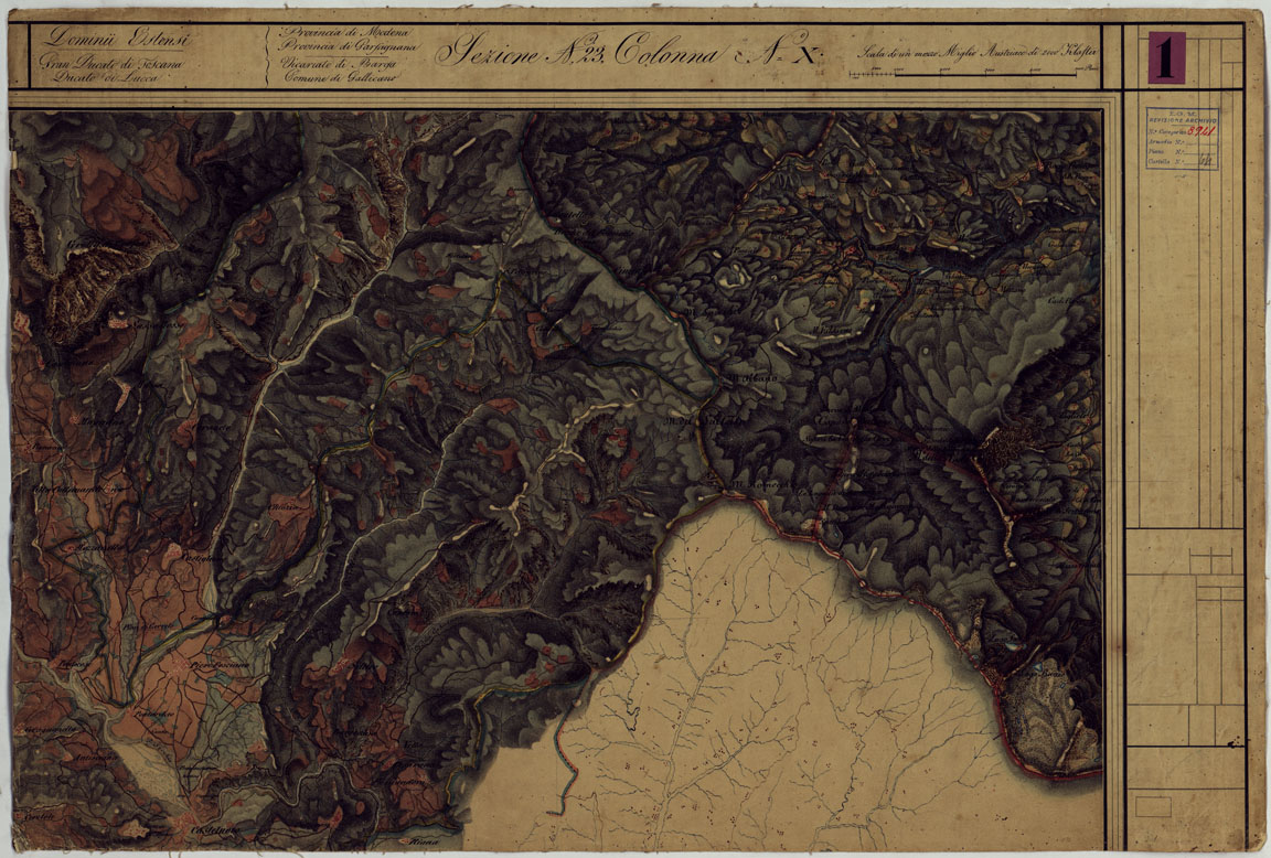 "Sono quarantacinque fogli rilevati sul terreno sotto la direzione del Magg. Carandini del Genio Modenese dal 1821 al 1828. Ad acquerello, con orografia rappresentata mediante tratteggio a luce zenitale, centri abitati e strade principali in rosso, idrografia in azzurro. A destra di ciascun foglio una colonna preparata per i dati statistici, le posizioni geografiche, ecc. in basso le firme degli ufficiali che attesero al lavoro. La carta venne incisa su rame nel 1828 dal R. I. Geogr. Milit. Austriaco in Milano e servì per la riproduzione e il disegno della carta alla scala di 1:86.400 (ved. N°10 d'ordine. Cart. d'Arch. N° 54, Docum. N°7 e 8). Alla carta è annesso un quadro d'unione. (Cnfr. Mori A., La cartografia ufficiale, ecc., pagg. 55-56). Due copie una delle quali incompleta: Docum. N° 8942. Una riduzione al 100.000 si compone di dieci fogli disegnati a colori. - Docum. N°8943). Nella Sezione 16 colonna XIII e nella Sezione 17 colonna XIII sono presenti dei fuori margine."