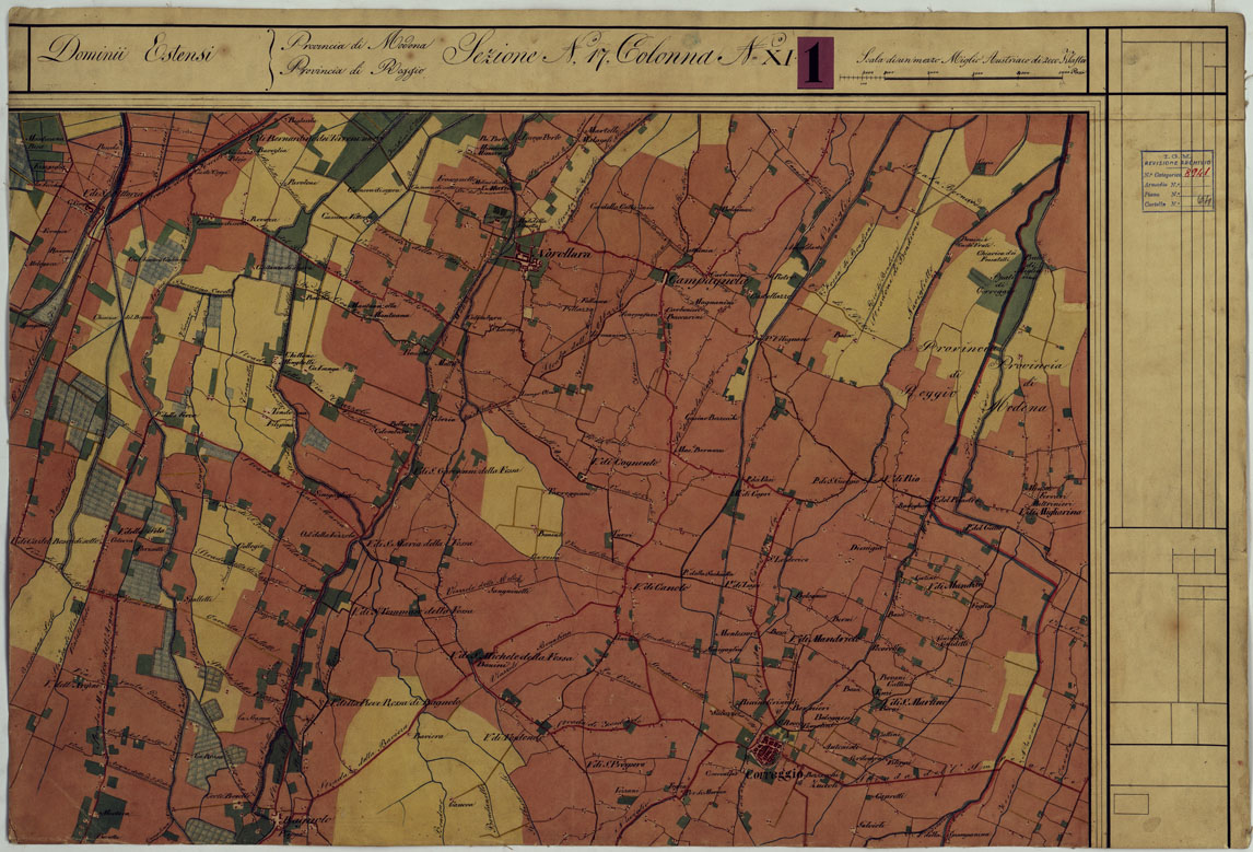 "Sono quarantacinque fogli rilevati sul terreno sotto la direzione del Magg. Carandini del Genio Modenese dal 1821 al 1828. Ad acquerello, con orografia rappresentata mediante tratteggio a luce zenitale, centri abitati e strade principali in rosso, idrografia in azzurro. A destra di ciascun foglio una colonna preparata per i dati statistici, le posizioni geografiche, ecc. in basso le firme degli ufficiali che attesero al lavoro. La carta venne incisa su rame nel 1828 dal R. I. Geogr. Milit. Austriaco in Milano e servì per la riproduzione e il disegno della carta alla scala di 1:86.400 (ved. N°10 d'ordine. Cart. d'Arch. N° 54, Docum. N°7 e 8). Alla carta è annesso un quadro d'unione. (Cnfr. Mori A., La cartografia ufficiale, ecc., pagg. 55-56). Due copie una delle quali incompleta: Docum. N° 8942. Una riduzione al 100.000 si compone di dieci fogli disegnati a colori. - Docum. N°8943). Nella Sezione 16 colonna XIII e nella Sezione 17 colonna XIII sono presenti dei fuori margine."