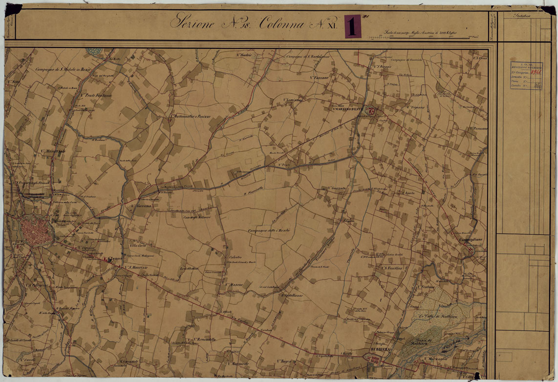 "Sono quarantacinque fogli rilevati sul terreno sotto la direzione del Magg. Carandini del Genio Modenese dal 1821 al 1828. Ad acquerello, con orografia rappresentata mediante tratteggio a luce zenitale, centri abitati e strade principali in rosso, idrografia in azzurro. A destra di ciascun foglio una colonna preparata per i dati statistici, le posizioni geografiche, ecc. in basso le firme degli ufficiali che attesero al lavoro. La carta venne incisa su rame nel 1828 dal R. I. Geogr. Milit. Austriaco in Milano e servì per la riproduzione e il disegno della carta alla scala di 1:86.400 (ved. N°10 d'ordine. Cart. d'Arch. N° 54, Docum. N°7 e 8). Alla carta è annesso un quadro d'unione. (Cnfr. Mori A., La cartografia ufficiale, ecc., pagg. 55-56). Due copie una delle quali incompleta: Docum. N° 8942. Una riduzione al 100.000 si compone di dieci fogli disegnati a colori. (File dal A0001200 al A0001208 Docum. N°8943). Nella Sezione 16 colonna XIII (File A0001191 - A0001192) e nella Sezione 17 colonna XIII (File A0001193 - A0001194) sono presenti dei fuori margine."