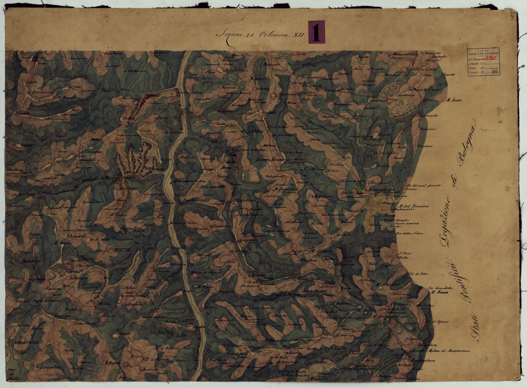 "Sono quarantacinque fogli rilevati sul terreno sotto la direzione del Magg. Carandini del Genio Modenese dal 1821 al 1828. Ad acquerello, con orografia rappresentata mediante tratteggio a luce zenitale, centri abitati e strade principali in rosso, idrografia in azzurro. A destra di ciascun foglio una colonna preparata per i dati statistici, le posizioni geografiche, ecc. in basso le firme degli ufficiali che attesero al lavoro. La carta venne incisa su rame nel 1828 dal R. I. Geogr. Milit. Austriaco in Milano e servì per la riproduzione e il disegno della carta alla scala di 1:86.400 (ved. N°10 d'ordine. Cart. d'Arch. N° 54, Docum. N°7 e 8). Alla carta è annesso un quadro d'unione. (Cnfr. Mori A., La cartografia ufficiale, ecc., pagg. 55-56). Due copie una delle quali incompleta: Docum. N° 8942. Una riduzione al 100.000 si compone di dieci fogli disegnati a colori. (File dal A0001200 al A0001208 Docum. N°8943). Nella Sezione 16 colonna XIII (File A0001191 - A0001192) e nella Sezione 17 colonna XIII (File A0001193 - A0001194) sono presenti dei fuori margine."