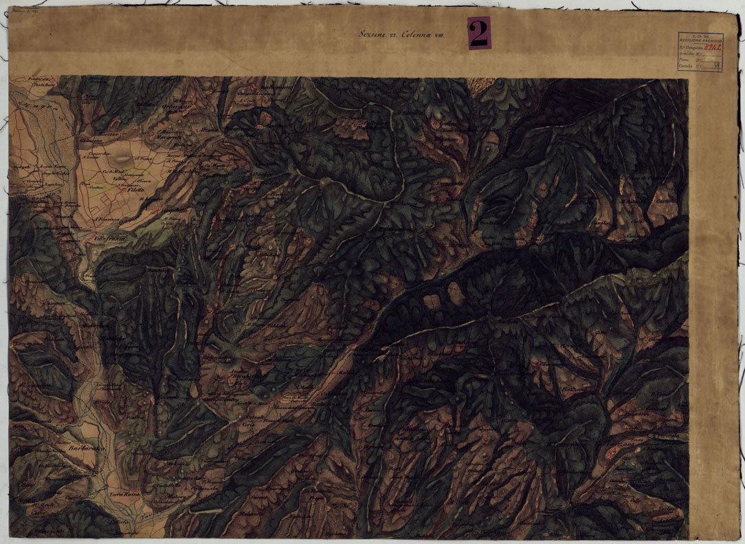 "Sono quarantotto fogli rilevati sul terreno sotto la direzione del Magg. Carandini del Genio Modenese dal 1821 al 1828. Ad acquerello, con orografia rappresentata mediante tratteggio a luce zenitale, centri abitati e strade principali in rosso, idrografia in azzurro. A destra di ciascun foglio una colonna preparata per i dati statistici, le posizioni geografiche, ecc. in basso le firme degli ufficiali che attesero al lavoro. La carta venne incisa su rame nel 1828 dal R. I. Geogr. Milit. Austriaco in Milano e servì per la riproduzione e il disegno della carta alla scala di 1:86.400 (ved. N°10 d'ordine. Cart. d'Arch. N° 54, Docum. N°7 e 8). Alla carta è annesso un quadro d'unione. (Cnfr. Mori A., La cartografia ufficiale, ecc., pagg. 55-56). Due copie una delle quali incompleta: Docum. N° 8942. Una riduzione al 100.000 si compone di dieci fogli disegnati a colori. Docum. N°8943). Nella Sezione 16 colonna XIII e nella Sezione 17 colonna XIII sono presenti dei fuori margine."