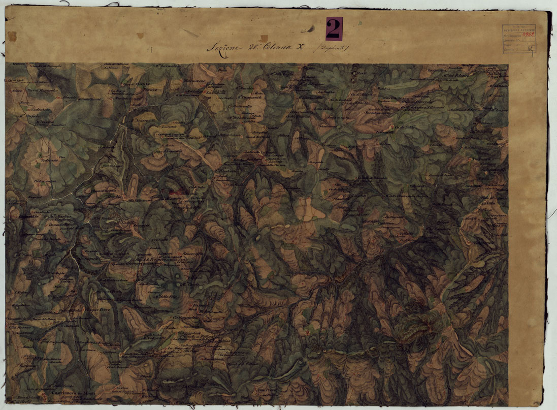 "Sono quarantotto fogli rilevati sul terreno sotto la direzione del Magg. Carandini del Genio Modenese dal 1821 al 1828. Ad acquerello, con orografia rappresentata mediante tratteggio a luce zenitale, centri abitati e strade principali in rosso, idrografia in azzurro. A destra di ciascun foglio una colonna preparata per i dati statistici, le posizioni geografiche, ecc. in basso le firme degli ufficiali che attesero al lavoro. La carta venne incisa su rame nel 1828 dal R. I. Geogr. Milit. Austriaco in Milano e servì per la riproduzione e il disegno della carta alla scala di 1:86.400 (ved. N°10 d'ordine. Cart. d'Arch. N° 54, Docum. N°7 e 8). Alla carta è annesso un quadro d'unione. (Cnfr. Mori A., La cartografia ufficiale, ecc., pagg. 55-56). Due copie una delle quali incompleta: Docum. N° 8942. Una riduzione al 100.000 si compone di dieci fogli disegnati a colori. Docum. N°8943). Nella Sezione 16 colonna XIII e nella Sezione 17 colonna XIII sono presenti dei fuori margine."
