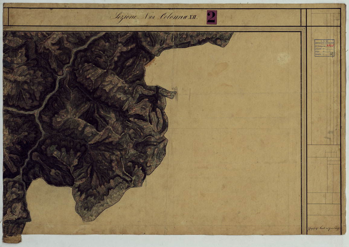"Sono quarantacinque fogli rilevati sul terreno sotto la direzione del Magg. Carandini del Genio Modenese dal 1821 al 1828. Ad acquerello, con orografia rappresentata mediante tratteggio a luce zenitale, centri abitati e strade principali in rosso, idrografia in azzurro. A destra di ciascun foglio una colonna preparata per i dati statistici, le posizioni geografiche, ecc. in basso le firme degli ufficiali che attesero al lavoro. La carta venne incisa su rame nel 1828 dal R. I. Geogr. Milit. Austriaco in Milano e servì per la riproduzione e il disegno della carta alla scala di 1:86.400 (ved. N°10 d'ordine. Cart. d'Arch. N° 54, Docum. N°7 e 8). Alla carta è annesso un quadro d'unione. (Cnfr. Mori A., La cartografia ufficiale, ecc., pagg. 55-56). Due copie una delle quali incompleta: Docum. N° 8942. Una riduzione al 100.000 si compone di dieci fogli disegnati a colori. Docum. N°8943). Nella Sezione 16 colonna XIII e nella Sezione 17 colonna XIII sono presenti dei fuori margine."