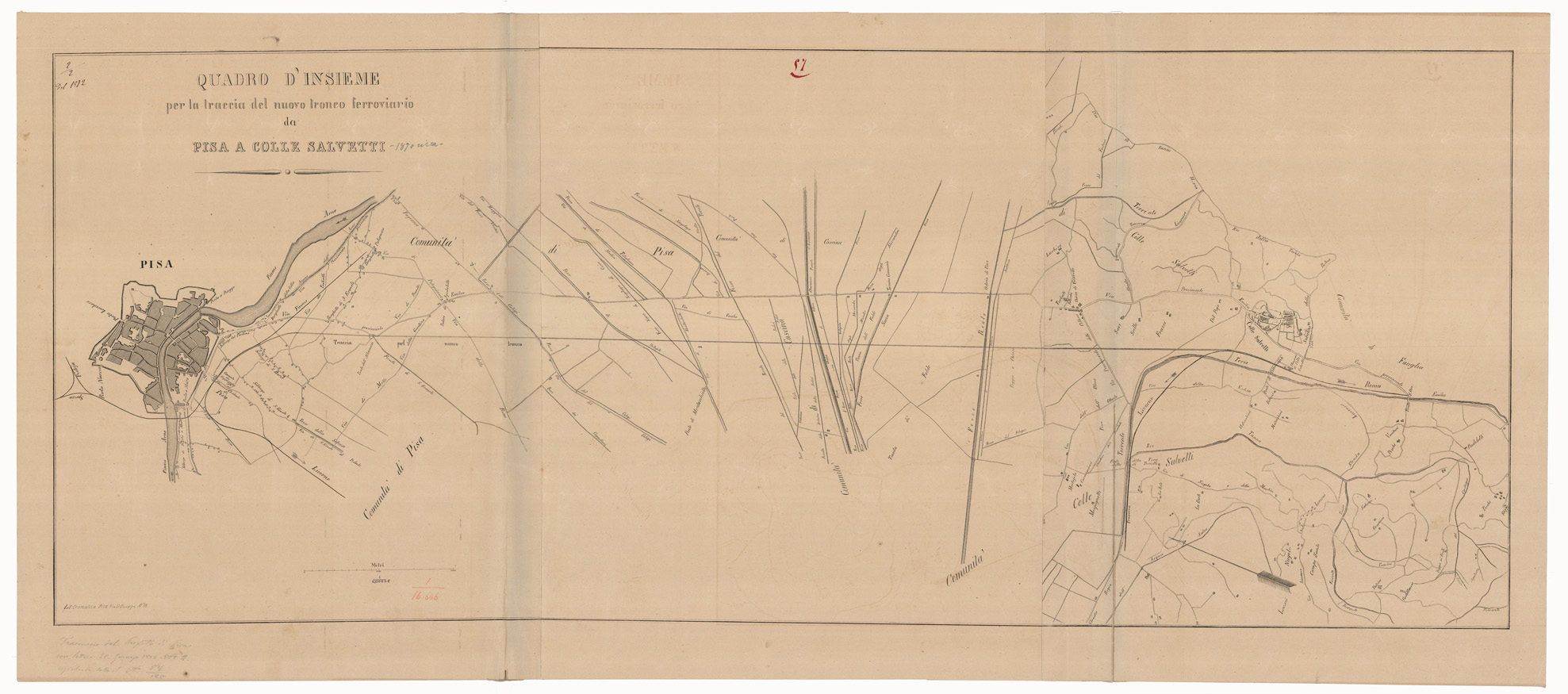 QUADRO D'INSIEME PER LA TRACCIA DEL NUOVO TRONCO FERROVIARIO DA PISA A COLLE SALVETTI LIT. CROMATICA. PISA. SECOLO XIX. SCALA DI 1:16.666.