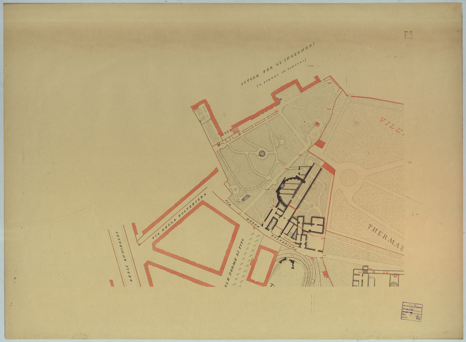 R. ACCADEMIA DEI LINCEI. PROF. VINCENZO REINA MEDIA PARS VRBIS RILIEVO PLANIMETRICO ED ALTIMETRICO ESEGUITO DAGLI ALLIEVI DELLA SCUOLA D'APPLICAZIONE PER GLI INGEGNERI IN ROMA COLLA GUIDA DEL PROF. U. BARBIERI DELL'ING. C. CASSINIS. ROMA.