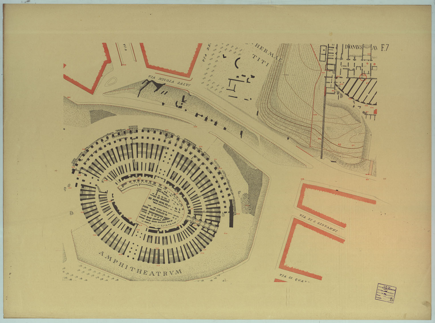R. ACCADEMIA DEI LINCEI. PROF. VINCENZO REINA MEDIA PARS VRBIS RILIEVO PLANIMETRICO ED ALTIMETRICO ESEGUITO DAGLI ALLIEVI DELLA SCUOLA D'APPLICAZIONE PER GLI INGEGNERI IN ROMA COLLA GUIDA DEL PROF. U. BARBIERI DELL'ING. C. CASSINIS. ROMA.