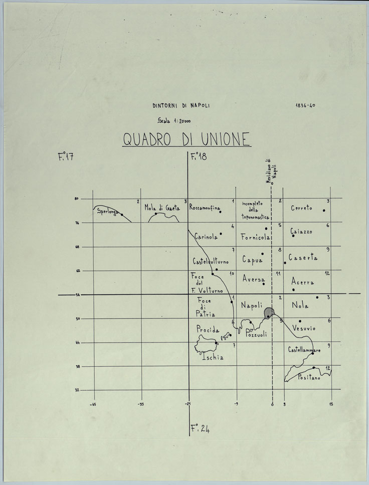 DISEGNI ORIGINALI DELLA CARTA DEI DINTORNI DI NAPOLI ALLA SCALA DI 1: 20.000 ESEGUITI NELL'UFFICIO TOPOGRAFICO DELL'EX - REGNO DI NAPOLI 1836-40 - QUADRO D'UNIONE.