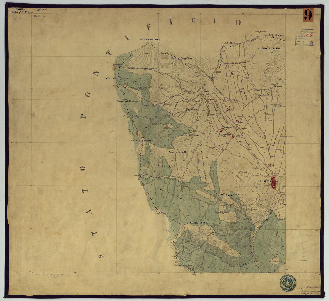 "Sono 167 tavolette montate su tela o seta, copiate e messe in netto all'Officio Topografico di Napoli su le levate eseguite dal 1834 al 1860 per la formazione della Carta del Reame di Napoli alla scala di 1:80.000. L'esecuzione di questa carta venne decretata nel 1814: essa fu però iniziata, dati i movimenti politici di quell'epoca, soltanto nel 1833. Queste tavolette si riferiscono ai fogli 1, 5, 8, 9, 12, 13, 17-19, 28, 29, 33 della suddetta carta la quale doveva essere disegnata ed incisa su rame a bulino in fogli rettangolari con orografia a tratteggio e curve di livello tracciate alla equidistanza di 10 passi (m. 18,52) o di 52 passi (m. 92,60). Di essa peraltro furono pubblicati solamente cinque fogli, cioè: Napoli, Caserta, Gaeta, Leonessa, Cittaducale, tra il 1861 e 1870. L'I.G.M. conserva i rami dei primi tre di questi fogli. La carta all'80.000, pregevolissima per valore artistico e scientifico, venne giudicata superiore alle altre produzioni cartografiche contemporanee non solo italiane, ma europee (cfr. Mori A., La cartografia ufficiale in Italia e l'I.G.M. 1922, pag.107). Le tavolette sono disegnate a colori rosso per gli abitati, azzurro per le acque, verde per le vegetazioni, nero per le curve di livello, rete stradale, toponomastica e il rimanente della planimetria. Rappresentano l'orografia con le curve di livello, sostituite al sistema di tratteggio fino allora seguito, parte tracciate direttamente dagli operatori, parte completate a tavolino in base ai dati raccolti. Le tavolette sono suddivise a gruppi in base al foglio della carta all'80.000 cui si riferiscono ciascun gruppo reca annesso i nomi degli operatori e il visto del topografo capo. Annesso un "Quadro d'unione delle levate alla scala di 1:20.000 eseguite fino a tutto il 1860 dal R. Officio Topografico Napoletano" alla scala di 1:490.700, stampato nel 1884. Il documento è ripartito in Cart. d'Arch. n°75 (che comprende 52 fogli), n° 76 (48 fogli), n° 77 (44 fogli)."