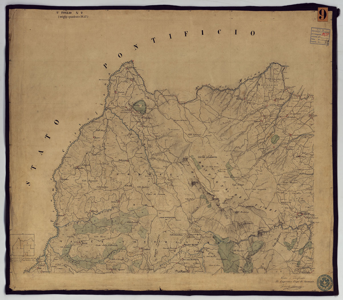 "Sono 167 tavolette montate su tela o seta, copiate e messe in netto all'Officio Topografico di Napoli su le levate eseguite dal 1834 al 1860 per la formazione della Carta del Reame di Napoli alla scala di 1:80.000. L'esecuzione di questa carta venne decretata nel 1814: essa fu però iniziata, dati i movimenti politici di quell'epoca, soltanto nel 1833. Queste tavolette si riferiscono ai fogli 1, 5, 8, 9, 12, 13, 17-19, 28, 29, 33 della suddetta carta la quale doveva essere disegnata ed incisa su rame a bulino in fogli rettangolari con orografia a tratteggio e curve di livello tracciate alla equidistanza di 10 passi (m. 18,52) o di 52 passi (m. 92,60). Di essa peraltro furono pubblicati solamente cinque fogli, cioè: Napoli, Caserta, Gaeta, Leonessa, Cittaducale, tra il 1861 e 1870. L'I.G.M. conserva i rami dei primi tre di questi fogli. La carta all'80.000, pregevolissima per valore artistico e scientifico, venne giudicata superiore alle altre produzioni cartografiche contemporanee non solo italiane, ma europee (cfr. Mori A., La cartografia ufficiale in Italia e l'I.G.M. 1922, pag.107). Le tavolette sono disegnate a colori rosso per gli abitati, azzurro per le acque, verde per le vegetazioni, nero per le curve di livello, rete stradale, toponomastica e il rimanente della planimetria. Rappresentano l'orografia con le curve di livello, sostituite al sistema di tratteggio fino allora seguito, parte tracciate direttamente dagli operatori, parte completate a tavolino in base ai dati raccolti. Le tavolette sono suddivise a gruppi in base al foglio della carta all'80.000 cui si riferiscono ciascun gruppo reca annesso i nomi degli operatori e il visto del topografo capo. Annesso un "Quadro d'unione delle levate alla scala di 1:20.000 eseguite fino a tutto il 1860 dal R. Officio Topografico Napoletano" alla scala di 1:490.700, stampato nel 1884. Il documento è ripartito in Cart. d'Arch. n°75 (che comprende 52 fogli), n° 76 (48 fogli), n° 77 (44 fogli)."