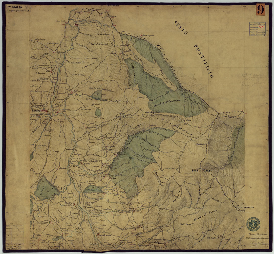 "Sono 167 tavolette montate su tela o seta, copiate e messe in netto all'Officio Topografico di Napoli su le levate eseguite dal 1834 al 1860 per la formazione della Carta del Reame di Napoli alla scala di 1:80.000. L'esecuzione di questa carta venne decretata nel 1814: essa fu però iniziata, dati i movimenti politici di quell'epoca, soltanto nel 1833. Queste tavolette si riferiscono ai fogli 1, 5, 8, 9, 12, 13, 17-19, 28, 29, 33 della suddetta carta la quale doveva essere disegnata ed incisa su rame a bulino in fogli rettangolari con orografia a tratteggio e curve di livello tracciate alla equidistanza di 10 passi (m. 18,52) o di 52 passi (m. 92,60). Di essa peraltro furono pubblicati solamente cinque fogli, cioè: Napoli, Caserta, Gaeta, Leonessa, Cittaducale, tra il 1861 e 1870. L'I.G.M. conserva i rami dei primi tre di questi fogli. La carta all'80.000, pregevolissima per valore artistico e scientifico, venne giudicata superiore alle altre produzioni cartografiche contemporanee non solo italiane, ma europee (cfr. Mori A., La cartografia ufficiale in Italia e l'I.G.M. 1922, pag.107). Le tavolette sono disegnate a colori rosso per gli abitati, azzurro per le acque, verde per le vegetazioni, nero per le curve di livello, rete stradale, toponomastica e il rimanente della planimetria. Rappresentano l'orografia con le curve di livello, sostituite al sistema di tratteggio fino allora seguito, parte tracciate direttamente dagli operatori, parte completate a tavolino in base ai dati raccolti. Le tavolette sono suddivise a gruppi in base al foglio della carta all'80.000 cui si riferiscono ciascun gruppo reca annesso i nomi degli operatori e il visto del topografo capo. Annesso un "Quadro d'unione delle levate alla scala di 1:20.000 eseguite fino a tutto il 1860 dal R. Officio Topografico Napoletano" alla scala di 1:490.700, stampato nel 1884. Il documento è ripartito in Cart. d'Arch. n°75 (che comprende 52 fogli), n° 76 (48 fogli), n° 77 (44 fogli)."