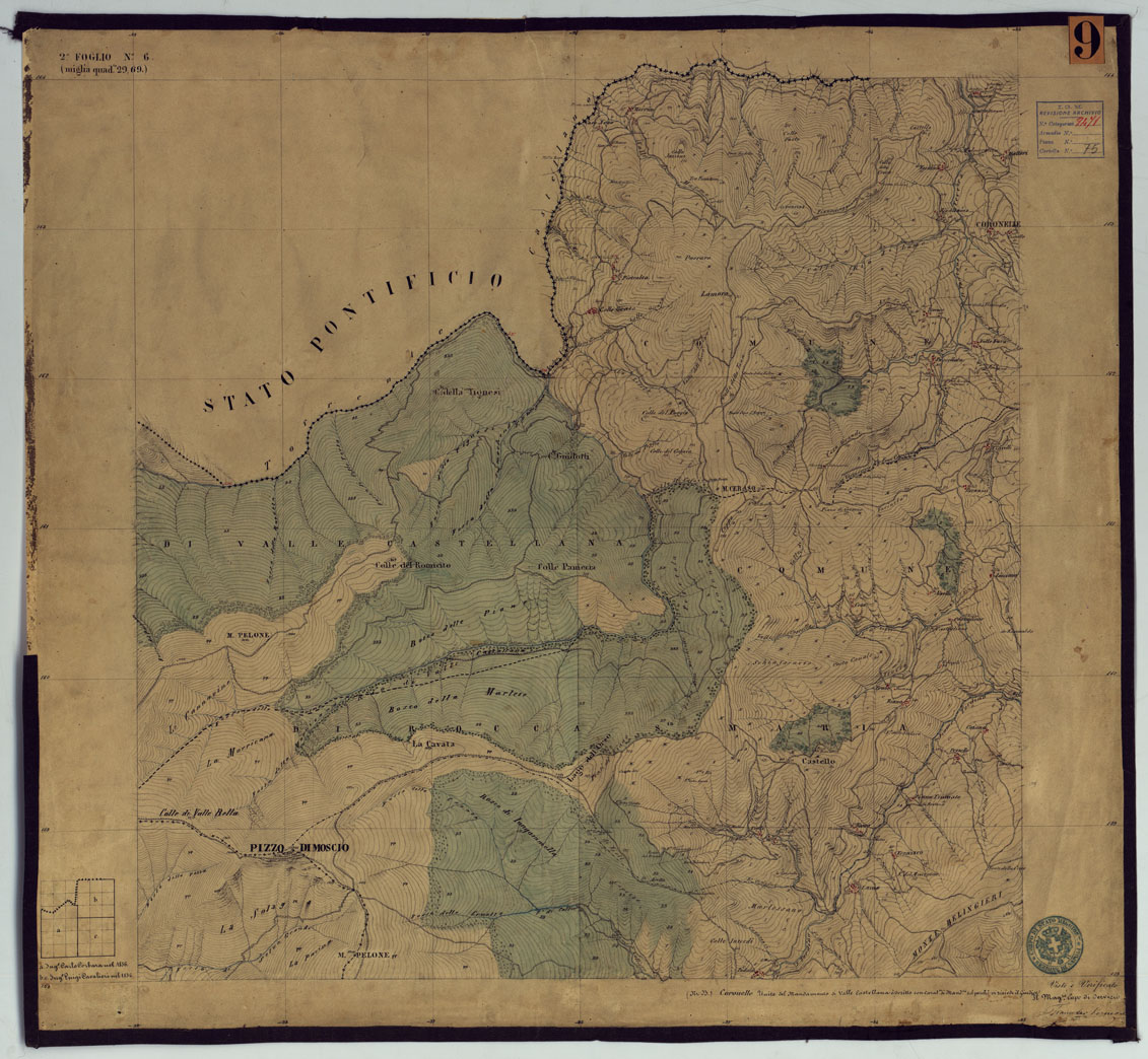 "Sono 167 tavolette montate su tela o seta, copiate e messe in netto all'Officio Topografico di Napoli su le levate eseguite dal 1834 al 1860 per la formazione della Carta del Reame di Napoli alla scala di 1:80.000. L'esecuzione di questa carta venne decretata nel 1814: essa fu però iniziata, dati i movimenti politici di quell'epoca, soltanto nel 1833. Queste tavolette si riferiscono ai fogli 1, 5, 8, 9, 12, 13, 17-19, 28, 29, 33 della suddetta carta la quale doveva essere disegnata ed incisa su rame a bulino in fogli rettangolari con orografia a tratteggio e curve di livello tracciate alla equidistanza di 10 passi (m. 18,52) o di 52 passi (m. 92,60). Di essa peraltro furono pubblicati solamente cinque fogli, cioè: Napoli, Caserta, Gaeta, Leonessa, Cittaducale, tra il 1861 e 1870. L'I.G.M. conserva i rami dei primi tre di questi fogli. La carta all'80.000, pregevolissima per valore artistico e scientifico, venne giudicata superiore alle altre produzioni cartografiche contemporanee non solo italiane, ma europee (cfr. Mori A., La cartografia ufficiale in Italia e l'I.G.M. 1922, pag.107). Le tavolette sono disegnate a colori rosso per gli abitati, azzurro per le acque, verde per le vegetazioni, nero per le curve di livello, rete stradale, toponomastica e il rimanente della planimetria. Rappresentano l'orografia con le curve di livello, sostituite al sistema di tratteggio fino allora seguito, parte tracciate direttamente dagli operatori, parte completate a tavolino in base ai dati raccolti. Le tavolette sono suddivise a gruppi in base al foglio della carta all'80.000 cui si riferiscono ciascun gruppo reca annesso i nomi degli operatori e il visto del topografo capo. Annesso un "Quadro d'unione delle levate alla scala di 1:20.000 eseguite fino a tutto il 1860 dal R. Officio Topografico Napoletano" alla scala di 1:490.700, stampato nel 1884. Il documento è ripartito in Cart. d'Arch. n°75 (che comprende 52 fogli), n° 76 (48 fogli), n° 77 (44 fogli)."