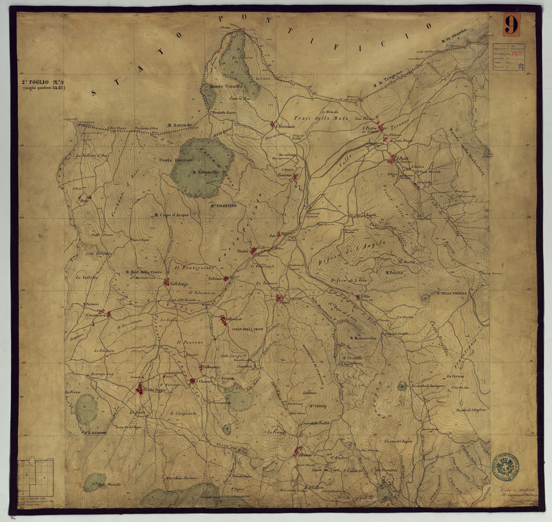 "Sono 167 tavolette montate su tela o seta, copiate e messe in netto all'Officio Topografico di Napoli su le levate eseguite dal 1834 al 1860 per la formazione della Carta del Reame di Napoli alla scala di 1:80.000. L'esecuzione di questa carta venne decretata nel 1814: essa fu però iniziata, dati i movimenti politici di quell'epoca, soltanto nel 1833. Queste tavolette si riferiscono ai fogli 1, 5, 8, 9, 12, 13, 17-19, 28, 29, 33 della suddetta carta la quale doveva essere disegnata ed incisa su rame a bulino in fogli rettangolari con orografia a tratteggio e curve di livello tracciate alla equidistanza di 10 passi (m. 18,52) o di 52 passi (m. 92,60). Di essa peraltro furono pubblicati solamente cinque fogli, cioè: Napoli, Caserta, Gaeta, Leonessa, Cittaducale, tra il 1861 e 1870. L'I.G.M. conserva i rami dei primi tre di questi fogli. La carta all'80.000, pregevolissima per valore artistico e scientifico, venne giudicata superiore alle altre produzioni cartografiche contemporanee non solo italiane, ma europee (cfr. Mori A., La cartografia ufficiale in Italia e l'I.G.M. 1922, pag.107). Le tavolette sono disegnate a colori rosso per gli abitati, azzurro per le acque, verde per le vegetazioni, nero per le curve di livello, rete stradale, toponomastica e il rimanente della planimetria. Rappresentano l'orografia con le curve di livello, sostituite al sistema di tratteggio fino allora seguito, parte tracciate direttamente dagli operatori, parte completate a tavolino in base ai dati raccolti. Le tavolette sono suddivise a gruppi in base al foglio della carta all'80.000 cui si riferiscono ciascun gruppo reca annesso i nomi degli operatori e il visto del topografo capo. Annesso un "Quadro d'unione delle levate alla scala di 1:20.000 eseguite fino a tutto il 1860 dal R. Officio Topografico Napoletano" alla scala di 1:490.700, stampato nel 1884. Il documento è ripartito in Cart. d'Arch. n°75 (che comprende 52 fogli), n° 76 (48 fogli), n° 77 (44 fogli)."