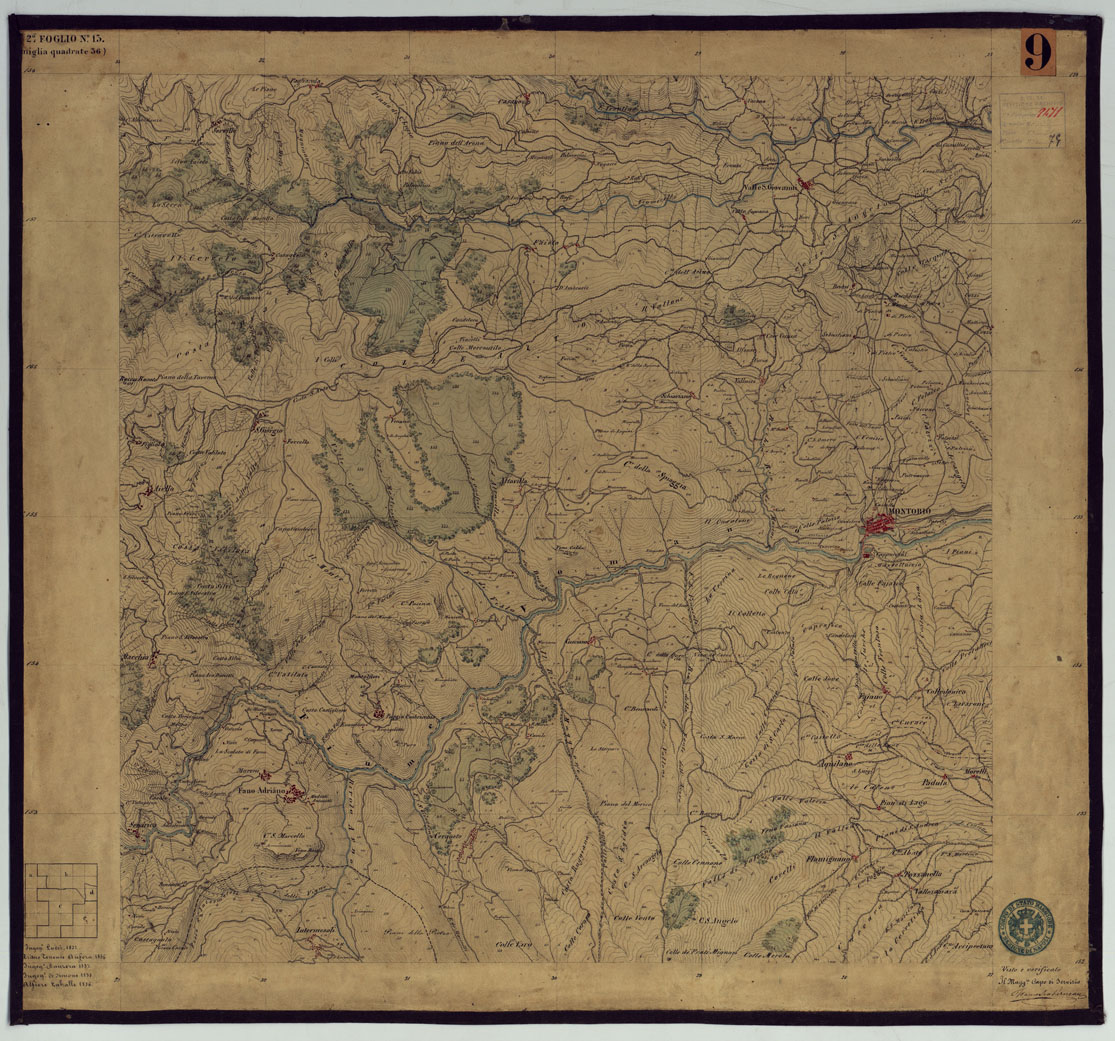 "Sono 167 tavolette montate su tela o seta, copiate e messe in netto all'Officio Topografico di Napoli su le levate eseguite dal 1834 al 1860 per la formazione della Carta del Reame di Napoli alla scala di 1:80.000. L'esecuzione di questa carta venne decretata nel 1814: essa fu però iniziata, dati i movimenti politici di quell'epoca, soltanto nel 1833. Queste tavolette si riferiscono ai fogli 1, 5, 8, 9, 12, 13, 17-19, 28, 29, 33 della suddetta carta la quale doveva essere disegnata ed incisa su rame a bulino in fogli rettangolari con orografia a tratteggio e curve di livello tracciate alla equidistanza di 10 passi (m. 18,52) o di 52 passi (m. 92,60). Di essa peraltro furono pubblicati solamente cinque fogli, cioè: Napoli, Caserta, Gaeta, Leonessa, Cittaducale, tra il 1861 e 1870. L'I.G.M. conserva i rami dei primi tre di questi fogli. La carta all'80.000, pregevolissima per valore artistico e scientifico, venne giudicata superiore alle altre produzioni cartografiche contemporanee non solo italiane, ma europee (cfr. Mori A., La cartografia ufficiale in Italia e l'I.G.M. 1922, pag.107). Le tavolette sono disegnate a colori rosso per gli abitati, azzurro per le acque, verde per le vegetazioni, nero per le curve di livello, rete stradale, toponomastica e il rimanente della planimetria. Rappresentano l'orografia con le curve di livello, sostituite al sistema di tratteggio fino allora seguito, parte tracciate direttamente dagli operatori, parte completate a tavolino in base ai dati raccolti. Le tavolette sono suddivise a gruppi in base al foglio della carta all'80.000 cui si riferiscono ciascun gruppo reca annesso i nomi degli operatori e il visto del topografo capo. Annesso un "Quadro d'unione delle levate alla scala di 1:20.000 eseguite fino a tutto il 1860 dal R. Officio Topografico Napoletano" alla scala di 1:490.700, stampato nel 1884. Il documento è ripartito in Cart. d'Arch. n°75 (che comprende 52 fogli), n° 76 (48 fogli), n° 77 (44 fogli)."