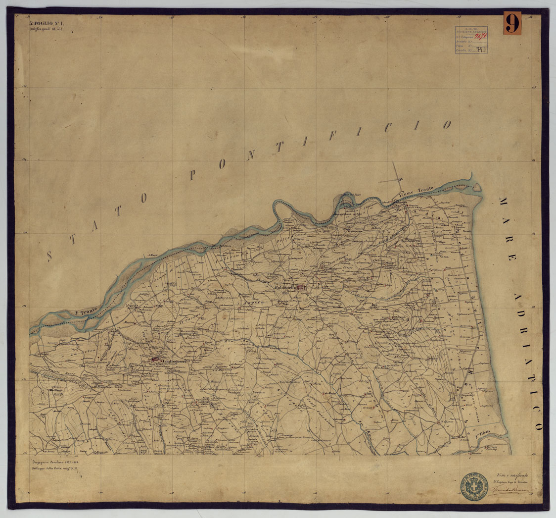"Sono 167 tavolette montate su tela o seta, copiate e messe in netto all'Officio Topografico di Napoli su le levate eseguite dal 1834 al 1860 per la formazione della Carta del Reame di Napoli alla scala di 1:80.000. L'esecuzione di questa carta venne decretata nel 1814: essa fu però iniziata, dati i movimenti politici di quell'epoca, soltanto nel 1833. Queste tavolette si riferiscono ai fogli 1, 5, 8, 9, 12, 13, 17-19, 28, 29, 33 della suddetta carta la quale doveva essere disegnata ed incisa su rame a bulino in fogli rettangolari con orografia a tratteggio e curve di livello tracciate alla equidistanza di 10 passi (m. 18,52) o di 52 passi (m. 92,60). Di essa peraltro furono pubblicati solamente cinque fogli, cioè: Napoli, Caserta, Gaeta, Leonessa, Cittaducale, tra il 1861 e 1870. L'I.G.M. conserva i rami dei primi tre di questi fogli. La carta all'80.000, pregevolissima per valore artistico e scientifico, venne giudicata superiore alle altre produzioni cartografiche contemporanee non solo italiane, ma europee (cfr. Mori A., La cartografia ufficiale in Italia e l'I.G.M. 1922, pag.107). Le tavolette sono disegnate a colori rosso per gli abitati, azzurro per le acque, verde per le vegetazioni, nero per le curve di livello, rete stradale, toponomastica e il rimanente della planimetria. Rappresentano l'orografia con le curve di livello, sostituite al sistema di tratteggio fino allora seguito, parte tracciate direttamente dagli operatori, parte completate a tavolino in base ai dati raccolti. Le tavolette sono suddivise a gruppi in base al foglio della carta all'80.000 cui si riferiscono ciascun gruppo reca annesso i nomi degli operatori e il visto del topografo capo. Annesso un "Quadro d'unione delle levate alla scala di 1:20.000 eseguite fino a tutto il 1860 dal R. Officio Topografico Napoletano" alla scala di 1:490.700, stampato nel 1884. Il documento è ripartito in Cart. d'Arch. n°75 (che comprende 52 fogli), n° 76 (48 fogli), n° 77 (44 fogli)."