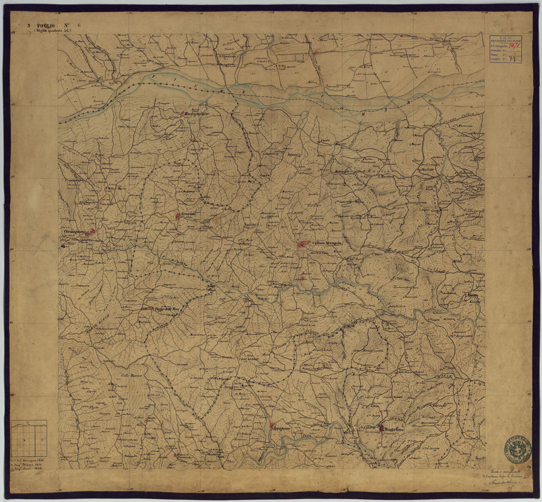 "Sono 167 tavolette montate su tela o seta, copiate e messe in netto all'Officio Topografico di Napoli su le levate eseguite dal 1834 al 1860 per la formazione della Carta del Reame di Napoli alla scala di 1:80.000. L'esecuzione di questa carta venne decretata nel 1814: essa fu però iniziata, dati i movimenti politici di quell'epoca, soltanto nel 1833. Queste tavolette si riferiscono ai fogli 1, 5, 8, 9, 12, 13, 17-19, 28, 29, 33 della suddetta carta la quale doveva essere disegnata ed incisa su rame a bulino in fogli rettangolari con orografia a tratteggio e curve di livello tracciate alla equidistanza di 10 passi (m. 18,52) o di 52 passi (m. 92,60). Di essa peraltro furono pubblicati solamente cinque fogli, cioè: Napoli, Caserta, Gaeta, Leonessa, Cittaducale, tra il 1861 e 1870. L'I.G.M. conserva i rami dei primi tre di questi fogli. La carta all'80.000, pregevolissima per valore artistico e scientifico, venne giudicata superiore alle altre produzioni cartografiche contemporanee non solo italiane, ma europee (cfr. Mori A., La cartografia ufficiale in Italia e l'I.G.M. 1922, pag.107). Le tavolette sono disegnate a colori rosso per gli abitati, azzurro per le acque, verde per le vegetazioni, nero per le curve di livello, rete stradale, toponomastica e il rimanente della planimetria. Rappresentano l'orografia con le curve di livello, sostituite al sistema di tratteggio fino allora seguito, parte tracciate direttamente dagli operatori, parte completate a tavolino in base ai dati raccolti. Le tavolette sono suddivise a gruppi in base al foglio della carta all'80.000 cui si riferiscono ciascun gruppo reca annesso i nomi degli operatori e il visto del topografo capo. Annesso un "Quadro d'unione delle levate alla scala di 1:20.000 eseguite fino a tutto il 1860 dal R. Officio Topografico Napoletano" alla scala di 1:490.700, stampato nel 1884. Il documento è ripartito in Cart. d'Arch. n°75 (che comprende 52 fogli), n° 76 (48 fogli), n° 77 (44 fogli)."