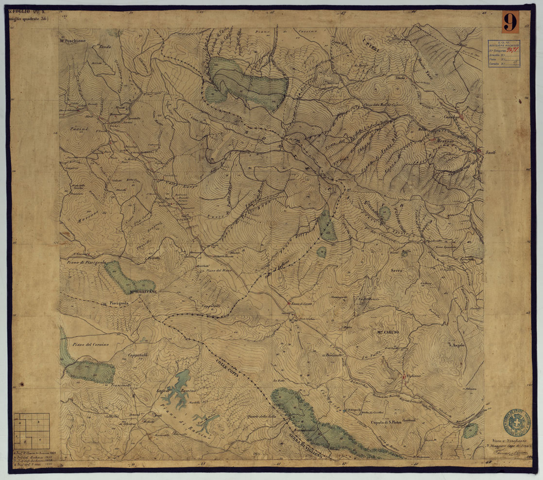 "Sono 167 tavolette montate su tela o seta, copiate e messe in netto all'Officio Topografico di Napoli su le levate eseguite dal 1834 al 1860 per la formazione della Carta del Reame di Napoli alla scala di 1:80.000. L'esecuzione di questa carta venne decretata nel 1814: essa fu però iniziata, dati i movimenti politici di quell'epoca, soltanto nel 1833. Queste tavolette si riferiscono ai fogli 1, 5, 8, 9, 12, 13, 17-19, 28, 29, 33 della suddetta carta la quale doveva essere disegnata ed incisa su rame a bulino in fogli rettangolari con orografia a tratteggio e curve di livello tracciate alla equidistanza di 10 passi (m. 18,52) o di 52 passi (m. 92,60). Di essa peraltro furono pubblicati solamente cinque fogli, cioè: Napoli, Caserta, Gaeta, Leonessa, Cittaducale, tra il 1861 e 1870. L'I.G.M. conserva i rami dei primi tre di questi fogli. La carta all'80.000, pregevolissima per valore artistico e scientifico, venne giudicata superiore alle altre produzioni cartografiche contemporanee non solo italiane, ma europee (cfr. Mori A., La cartografia ufficiale in Italia e l'I.G.M. 1922, pag.107). Le tavolette sono disegnate a colori rosso per gli abitati, azzurro per le acque, verde per le vegetazioni, nero per le curve di livello, rete stradale, toponomastica e il rimanente della planimetria. Rappresentano l'orografia con le curve di livello, sostituite al sistema di tratteggio fino allora seguito, parte tracciate direttamente dagli operatori, parte completate a tavolino in base ai dati raccolti. Le tavolette sono suddivise a gruppi in base al foglio della carta all'80.000 cui si riferiscono ciascun gruppo reca annesso i nomi degli operatori e il visto del topografo capo. Annesso un "Quadro d'unione delle levate alla scala di 1:20.000 eseguite fino a tutto il 1860 dal R. Officio Topografico Napoletano" alla scala di 1:490.700, stampato nel 1884. Il documento è ripartito in Cart. d'Arch. n°75 (che comprende 52 fogli), n° 76 (48 fogli), n° 77 (44 fogli)."
