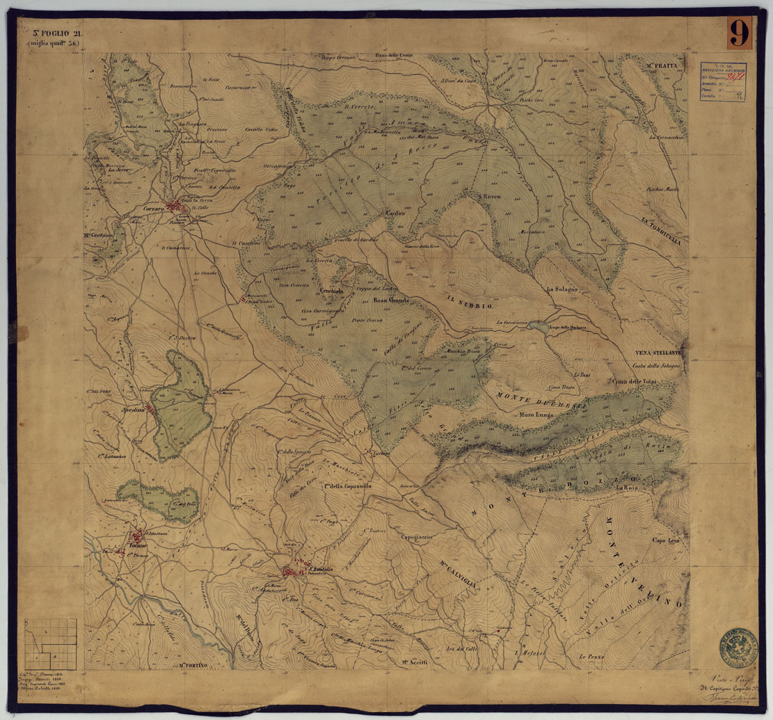 "Sono 167 tavolette montate su tela o seta, copiate e messe in netto all'Officio Topografico di Napoli su le levate eseguite dal 1834 al 1860 per la formazione della Carta del Reame di Napoli alla scala di 1:80.000. L'esecuzione di questa carta venne decretata nel 1814: essa fu però iniziata, dati i movimenti politici di quell'epoca, soltanto nel 1833. Queste tavolette si riferiscono ai fogli 1, 5, 8, 9, 12, 13, 17-19, 28, 29, 33 della suddetta carta la quale doveva essere disegnata ed incisa su rame a bulino in fogli rettangolari con orografia a tratteggio e curve di livello tracciate alla equidistanza di 10 passi (m. 18,52) o di 52 passi (m. 92,60). Di essa peraltro furono pubblicati solamente cinque fogli, cioè: Napoli, Caserta, Gaeta, Leonessa, Cittaducale, tra il 1861 e 1870. L'I.G.M. conserva i rami dei primi tre di questi fogli. La carta all'80.000, pregevolissima per valore artistico e scientifico, venne giudicata superiore alle altre produzioni cartografiche contemporanee non solo italiane, ma europee (cfr. Mori A., La cartografia ufficiale in Italia e l'I.G.M. 1922, pag.107). Le tavolette sono disegnate a colori rosso per gli abitati, azzurro per le acque, verde per le vegetazioni, nero per le curve di livello, rete stradale, toponomastica e il rimanente della planimetria. Rappresentano l'orografia con le curve di livello, sostituite al sistema di tratteggio fino allora seguito, parte tracciate direttamente dagli operatori, parte completate a tavolino in base ai dati raccolti. Le tavolette sono suddivise a gruppi in base al foglio della carta all'80.000 cui si riferiscono ciascun gruppo reca annesso i nomi degli operatori e il visto del topografo capo. Annesso un "Quadro d'unione delle levate alla scala di 1:20.000 eseguite fino a tutto il 1860 dal R. Officio Topografico Napoletano" alla scala di 1:490.700, stampato nel 1884. Il documento è ripartito in Cart. d'Arch. n°75 (che comprende 52 fogli), n° 76 (48 fogli), n° 77 (44 fogli)."