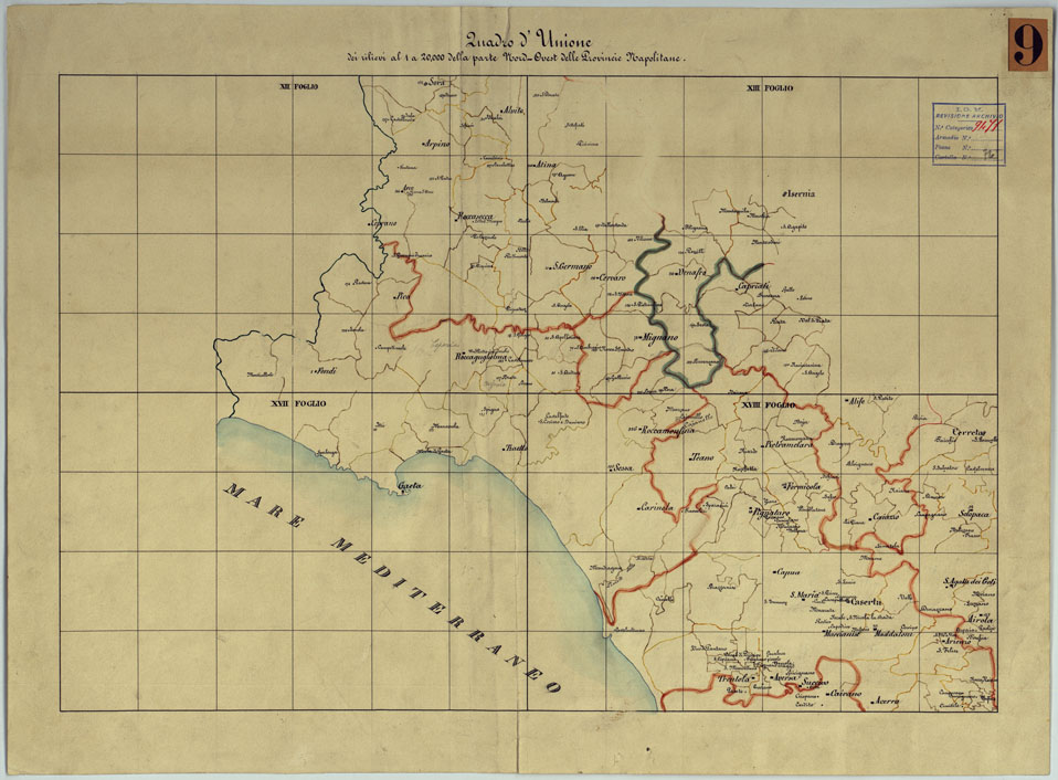 "Sono 167 tavolette montate su tela o seta, copiate e messe in netto all'Officio Topografico di Napoli su le levate eseguite dal 1834 al 1860 per la formazione della Carta del Reame di Napoli alla scala di 1:80.000. L'esecuzione di questa carta venne decretata nel 1814: essa fu però iniziata, dati i movimenti politici di quell'epoca, soltanto nel 1833. Queste tavolette si riferiscono ai fogli 1, 5, 8, 9, 12, 13, 17-19, 28, 29, 33 della suddetta carta la quale doveva essere disegnata ed incisa su rame a bulino in fogli rettangolari con orografia a tratteggio e curve di livello tracciate alla equidistanza di 10 passi (m. 18,52) o di 52 passi (m. 92,60). Di essa peraltro furono pubblicati solamente cinque fogli, cioè: Napoli, Caserta, Gaeta, Leonessa, Cittaducale, tra il 1861 e 1870. L'I.G.M. conserva i rami dei primi tre di questi fogli. La carta all'80.000, pregevolissima per valore artistico e scientifico, venne giudicata superiore alle altre produzioni cartografiche contemporanee non solo italiane, ma europee (cfr. Mori A., La cartografia ufficiale in Italia e l'I.G.M. 1922, pag.107). Le tavolette sono disegnate a colori rosso per gli abitati, azzurro per le acque, verde per le vegetazioni, nero per le curve di livello, rete stradale, toponomastica e il rimanente della planimetria. Rappresentano l'orografia con le curve di livello, sostituite al sistema di tratteggio fino allora seguito, parte tracciate direttamente dagli operatori, parte completate a tavolino in base ai dati raccolti. Le tavolette sono suddivise a gruppi in base al foglio della carta all'80.000 cui si riferiscono ciascun gruppo reca annesso i nomi degli operatori e il visto del topografo capo. Annesso un "Quadro d'unione delle levate alla scala di 1:20.000 eseguite fino a tutto il 1860 dal R. Officio Topografico Napoletano" alla scala di 1:490.700, stampato nel 1884. Il documento è ripartito in Cart. d'Arch. n°75 (che comprende 52 fogli), n° 76 (48 fogli), n° 77 (44 fogli)."