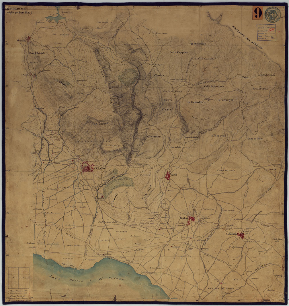 "Sono 167 tavolette montate su tela o seta, copiate e messe in netto all'Officio Topografico di Napoli su le levate eseguite dal 1834 al 1860 per la formazione della Carta del Reame di Napoli alla scala di 1:80.000. L'esecuzione di questa carta venne decretata nel 1814: essa fu però iniziata, dati i movimenti politici di quell'epoca, soltanto nel 1833. Queste tavolette si riferiscono ai fogli 1, 5, 8, 9, 12, 13, 17-19, 28, 29, 33 della suddetta carta la quale doveva essere disegnata ed incisa su rame a bulino in fogli rettangolari con orografia a tratteggio e curve di livello tracciate alla equidistanza di 10 passi (m. 18,52) o di 52 passi (m. 92,60). Di essa peraltro furono pubblicati solamente cinque fogli, cioè: Napoli, Caserta, Gaeta, Leonessa, Cittaducale, tra il 1861 e 1870. L'I.G.M. conserva i rami dei primi tre di questi fogli. La carta all'80.000, pregevolissima per valore artistico e scientifico, venne giudicata superiore alle altre produzioni cartografiche contemporanee non solo italiane, ma europee (cfr. Mori A., La cartografia ufficiale in Italia e l'I.G.M. 1922, pag.107). Le tavolette sono disegnate a colori rosso per gli abitati, azzurro per le acque, verde per le vegetazioni, nero per le curve di livello, rete stradale, toponomastica e il rimanente della planimetria. Rappresentano l'orografia con le curve di livello, sostituite al sistema di tratteggio fino allora seguito, parte tracciate direttamente dagli operatori, parte completate a tavolino in base ai dati raccolti. Le tavolette sono suddivise a gruppi in base al foglio della carta all'80.000 cui si riferiscono ciascun gruppo reca annesso i nomi degli operatori e il visto del topografo capo. Annesso un "Quadro d'unione delle levate alla scala di 1:20.000 eseguite fino a tutto il 1860 dal R. Officio Topografico Napoletano" alla scala di 1:490.700, stampato nel 1884. Il documento è ripartito in Cart. d'Arch. n°75 (che comprende 52 fogli), n° 76 (48 fogli), n° 77 (44 fogli)."
