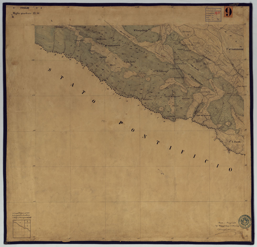 "Sono 167 tavolette montate su tela o seta, copiate e messe in netto all'Officio Topografico di Napoli su le levate eseguite dal 1834 al 1860 per la formazione della Carta del Reame di Napoli alla scala di 1:80.000. L'esecuzione di questa carta venne decretata nel 1814: essa fu però iniziata, dati i movimenti politici di quell'epoca, soltanto nel 1833. Queste tavolette si riferiscono ai fogli 1, 5, 8, 9, 12, 13, 17-19, 28, 29, 33 della suddetta carta la quale doveva essere disegnata ed incisa su rame a bulino in fogli rettangolari con orografia a tratteggio e curve di livello tracciate alla equidistanza di 10 passi (m. 18,52) o di 52 passi (m. 92,60). Di essa peraltro furono pubblicati solamente cinque fogli, cioè: Napoli, Caserta, Gaeta, Leonessa, Cittaducale, tra il 1861 e 1870. L'I.G.M. conserva i rami dei primi tre di questi fogli. La carta all'80.000, pregevolissima per valore artistico e scientifico, venne giudicata superiore alle altre produzioni cartografiche contemporanee non solo italiane, ma europee (cfr. Mori A., La cartografia ufficiale in Italia e l'I.G.M. 1922, pag.107). Le tavolette sono disegnate a colori rosso per gli abitati, azzurro per le acque, verde per le vegetazioni, nero per le curve di livello, rete stradale, toponomastica e il rimanente della planimetria. Rappresentano l'orografia con le curve di livello, sostituite al sistema di tratteggio fino allora seguito, parte tracciate direttamente dagli operatori, parte completate a tavolino in base ai dati raccolti. Le tavolette sono suddivise a gruppi in base al foglio della carta all'80.000 cui si riferiscono ciascun gruppo reca annesso i nomi degli operatori e il visto del topografo capo. Annesso un "Quadro d'unione delle levate alla scala di 1:20.000 eseguite fino a tutto il 1860 dal R. Officio Topografico Napoletano" alla scala di 1:490.700, stampato nel 1884. Il documento è ripartito in Cart. d'Arch. n°75 (che comprende 52 fogli), n° 76 (48 fogli), n° 77 (44 fogli)."
