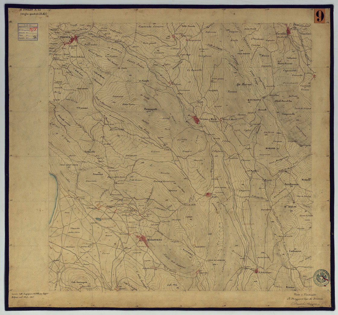"Sono 167 tavolette montate su tela o seta, copiate e messe in netto all'Officio Topografico di Napoli su le levate eseguite dal 1834 al 1860 per la formazione della Carta del Reame di Napoli alla scala di 1:80.000. L'esecuzione di questa carta venne decretata nel 1814: essa fu però iniziata, dati i movimenti politici di quell'epoca, soltanto nel 1833. Queste tavolette si riferiscono ai fogli 1, 5, 8, 9, 12, 13, 17-19, 28, 29, 33 della suddetta carta la quale doveva essere disegnata ed incisa su rame a bulino in fogli rettangolari con orografia a tratteggio e curve di livello tracciate alla equidistanza di 10 passi (m. 18,52) o di 52 passi (m. 92,60). Di essa peraltro furono pubblicati solamente cinque fogli, cioè: Napoli, Caserta, Gaeta, Leonessa, Cittaducale, tra il 1861 e 1870. L'I.G.M. conserva i rami dei primi tre di questi fogli. La carta all'80.000, pregevolissima per valore artistico e scientifico, venne giudicata superiore alle altre produzioni cartografiche contemporanee non solo italiane, ma europee (cfr. Mori A., La cartografia ufficiale in Italia e l'I.G.M. 1922, pag.107). Le tavolette sono disegnate a colori rosso per gli abitati, azzurro per le acque, verde per le vegetazioni, nero per le curve di livello, rete stradale, toponomastica e il rimanente della planimetria. Rappresentano l'orografia con le curve di livello, sostituite al sistema di tratteggio fino allora seguito, parte tracciate direttamente dagli operatori, parte completate a tavolino in base ai dati raccolti. Le tavolette sono suddivise a gruppi in base al foglio della carta all'80.000 cui si riferiscono ciascun gruppo reca annesso i nomi degli operatori e il visto del topografo capo. Annesso un "Quadro d'unione delle levate alla scala di 1:20.000 eseguite fino a tutto il 1860 dal R. Officio Topografico Napoletano" alla scala di 1:490.700, stampato nel 1884. Il documento è ripartito in Cart. d'Arch. n°75 (che comprende 52 fogli), n° 76 (48 fogli), n° 77 (44 fogli)."