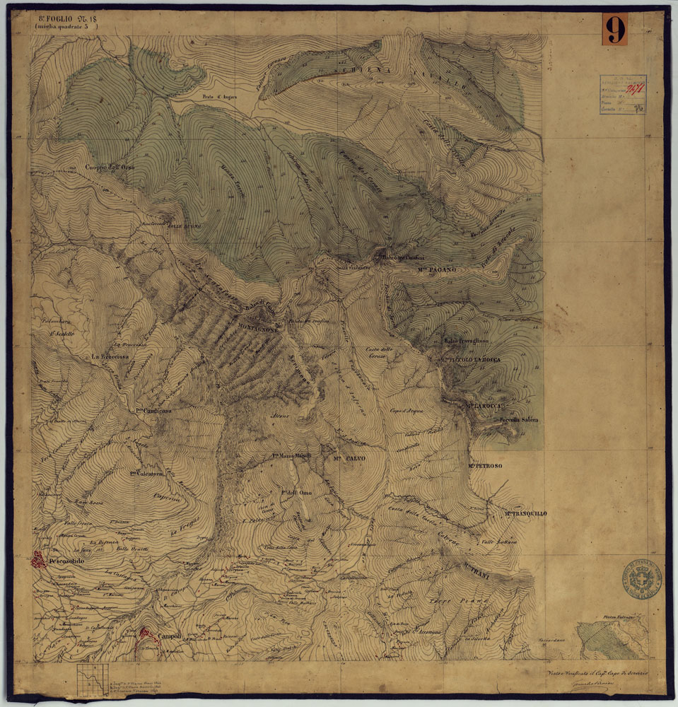 "Sono 167 tavolette montate su tela o seta, copiate e messe in netto all'Officio Topografico di Napoli su le levate eseguite dal 1834 al 1860 per la formazione della Carta del Reame di Napoli alla scala di 1:80.000. L'esecuzione di questa carta venne decretata nel 1814: essa fu però iniziata, dati i movimenti politici di quell'epoca, soltanto nel 1833. Queste tavolette si riferiscono ai fogli 1, 5, 8, 9, 12, 13, 17-19, 28, 29, 33 della suddetta carta la quale doveva essere disegnata ed incisa su rame a bulino in fogli rettangolari con orografia a tratteggio e curve di livello tracciate alla equidistanza di 10 passi (m. 18,52) o di 52 passi (m. 92,60). Di essa peraltro furono pubblicati solamente cinque fogli, cioè: Napoli, Caserta, Gaeta, Leonessa, Cittaducale, tra il 1861 e 1870. L'I.G.M. conserva i rami dei primi tre di questi fogli. La carta all'80.000, pregevolissima per valore artistico e scientifico, venne giudicata superiore alle altre produzioni cartografiche contemporanee non solo italiane, ma europee (cfr. Mori A., La cartografia ufficiale in Italia e l'I.G.M. 1922, pag.107). Le tavolette sono disegnate a colori rosso per gli abitati, azzurro per le acque, verde per le vegetazioni, nero per le curve di livello, rete stradale, toponomastica e il rimanente della planimetria. Rappresentano l'orografia con le curve di livello, sostituite al sistema di tratteggio fino allora seguito, parte tracciate direttamente dagli operatori, parte completate a tavolino in base ai dati raccolti. Le tavolette sono suddivise a gruppi in base al foglio della carta all'80.000 cui si riferiscono ciascun gruppo reca annesso i nomi degli operatori e il visto del topografo capo. Annesso un "Quadro d'unione delle levate alla scala di 1:20.000 eseguite fino a tutto il 1860 dal R. Officio Topografico Napoletano" alla scala di 1:490.700, stampato nel 1884. Il documento è ripartito in Cart. d'Arch. n°75 (che comprende 52 fogli), n° 76 (48 fogli), n° 77 (44 fogli)."