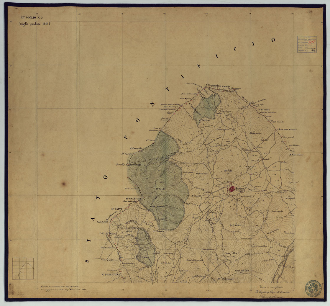 "Sono 167 tavolette montate su tela o seta, copiate e messe in netto all'Officio Topografico di Napoli su le levate eseguite dal 1834 al 1860 per la formazione della Carta del Reame di Napoli alla scala di 1:80.000. L'esecuzione di questa carta venne decretata nel 1814: essa fu però iniziata, dati i movimenti politici di quell'epoca, soltanto nel 1833. Queste tavolette si riferiscono ai fogli 1, 5, 8, 9, 12, 13, 17-19, 28, 29, 33 della suddetta carta la quale doveva essere disegnata ed incisa su rame a bulino in fogli rettangolari con orografia a tratteggio e curve di livello tracciate alla equidistanza di 10 passi (m. 18,52) o di 52 passi (m. 92,60). Di essa peraltro furono pubblicati solamente cinque fogli, cioè: Napoli, Caserta, Gaeta, Leonessa, Cittaducale, tra il 1861 e 1870. L'I.G.M. conserva i rami dei primi tre di questi fogli. La carta all'80.000, pregevolissima per valore artistico e scientifico, venne giudicata superiore alle altre produzioni cartografiche contemporanee non solo italiane, ma europee (cfr. Mori A., La cartografia ufficiale in Italia e l'I.G.M. 1922, pag.107). Le tavolette sono disegnate a colori rosso per gli abitati, azzurro per le acque, verde per le vegetazioni, nero per le curve di livello, rete stradale, toponomastica e il rimanente della planimetria. Rappresentano l'orografia con le curve di livello, sostituite al sistema di tratteggio fino allora seguito, parte tracciate direttamente dagli operatori, parte completate a tavolino in base ai dati raccolti. Le tavolette sono suddivise a gruppi in base al foglio della carta all'80.000 cui si riferiscono ciascun gruppo reca annesso i nomi degli operatori e il visto del topografo capo. Annesso un "Quadro d'unione delle levate alla scala di 1:20.000 eseguite fino a tutto il 1860 dal R. Officio Topografico Napoletano" alla scala di 1:490.700, stampato nel 1884. Il documento è ripartito in Cart. d'Arch. n°75 (che comprende 52 fogli), n° 76 (48 fogli), n° 77 (44 fogli)."