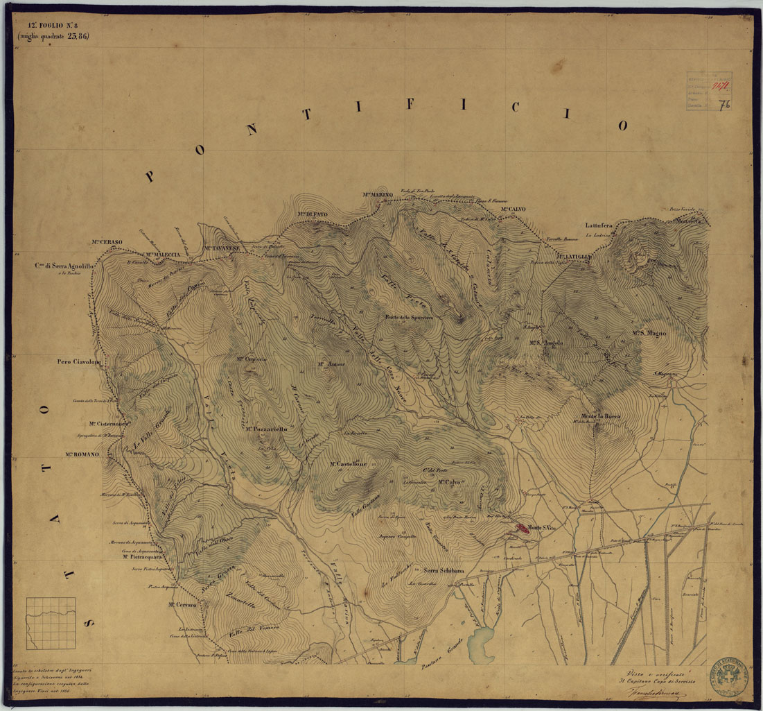 "Sono 167 tavolette montate su tela o seta, copiate e messe in netto all'Officio Topografico di Napoli su le levate eseguite dal 1834 al 1860 per la formazione della Carta del Reame di Napoli alla scala di 1:80.000. L'esecuzione di questa carta venne decretata nel 1814: essa fu però iniziata, dati i movimenti politici di quell'epoca, soltanto nel 1833. Queste tavolette si riferiscono ai fogli 1, 5, 8, 9, 12, 13, 17-19, 28, 29, 33 della suddetta carta la quale doveva essere disegnata ed incisa su rame a bulino in fogli rettangolari con orografia a tratteggio e curve di livello tracciate alla equidistanza di 10 passi (m. 18,52) o di 52 passi (m. 92,60). Di essa peraltro furono pubblicati solamente cinque fogli, cioè: Napoli, Caserta, Gaeta, Leonessa, Cittaducale, tra il 1861 e 1870. L'I.G.M. conserva i rami dei primi tre di questi fogli. La carta all'80.000, pregevolissima per valore artistico e scientifico, venne giudicata superiore alle altre produzioni cartografiche contemporanee non solo italiane, ma europee (cfr. Mori A., La cartografia ufficiale in Italia e l'I.G.M. 1922, pag.107). Le tavolette sono disegnate a colori rosso per gli abitati, azzurro per le acque, verde per le vegetazioni, nero per le curve di livello, rete stradale, toponomastica e il rimanente della planimetria. Rappresentano l'orografia con le curve di livello, sostituite al sistema di tratteggio fino allora seguito, parte tracciate direttamente dagli operatori, parte completate a tavolino in base ai dati raccolti. Le tavolette sono suddivise a gruppi in base al foglio della carta all'80.000 cui si riferiscono ciascun gruppo reca annesso i nomi degli operatori e il visto del topografo capo. Annesso un "Quadro d'unione delle levate alla scala di 1:20.000 eseguite fino a tutto il 1860 dal R. Officio Topografico Napoletano" alla scala di 1:490.700, stampato nel 1884. Il documento è ripartito in Cart. d'Arch. n°75 (che comprende 52 fogli), n° 76 (48 fogli), n° 77 (44 fogli)."