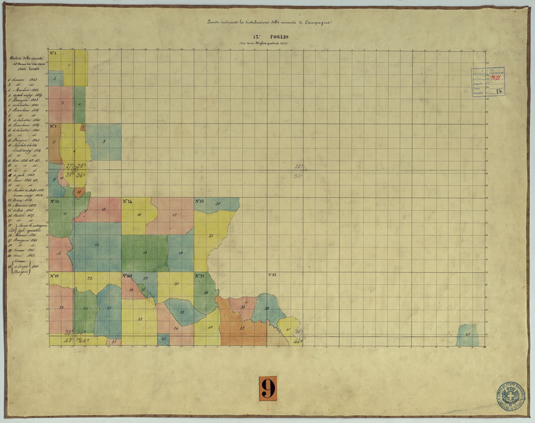 TAVOLETTE AL 20.000 PER LA CARTA DEL REGNO DI NAPOLI - FOGLIO 13° QUADRO INDICANTE LA DISTRIBUZIONE DELLE MINUTE DI CAMPAGNA.