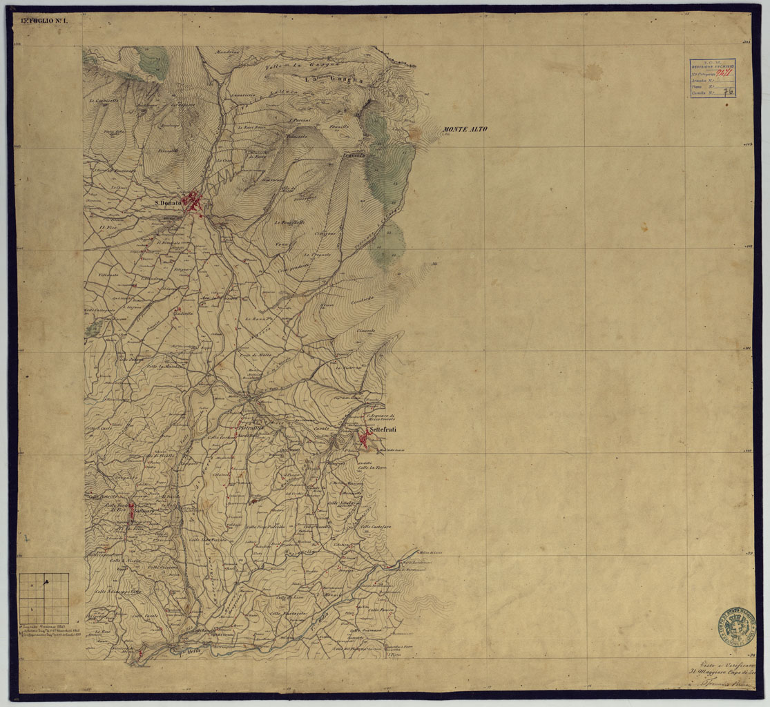 "Sono 167 tavolette montate su tela o seta, copiate e messe in netto all'Officio Topografico di Napoli su le levate eseguite dal 1834 al 1860 per la formazione della Carta del Reame di Napoli alla scala di 1:80.000. L'esecuzione di questa carta venne decretata nel 1814: essa fu però iniziata, dati i movimenti politici di quell'epoca, soltanto nel 1833. Queste tavolette si riferiscono ai fogli 1, 5, 8, 9, 12, 13, 17-19, 28, 29, 33 della suddetta carta la quale doveva essere disegnata ed incisa su rame a bulino in fogli rettangolari con orografia a tratteggio e curve di livello tracciate alla equidistanza di 10 passi (m. 18,52) o di 52 passi (m. 92,60). Di essa peraltro furono pubblicati solamente cinque fogli, cioè: Napoli, Caserta, Gaeta, Leonessa, Cittaducale, tra il 1861 e 1870. L'I.G.M. conserva i rami dei primi tre di questi fogli. La carta all'80.000, pregevolissima per valore artistico e scientifico, venne giudicata superiore alle altre produzioni cartografiche contemporanee non solo italiane, ma europee (cfr. Mori A., La cartografia ufficiale in Italia e l'I.G.M. 1922, pag.107). Le tavolette sono disegnate a colori rosso per gli abitati, azzurro per le acque, verde per le vegetazioni, nero per le curve di livello, rete stradale, toponomastica e il rimanente della planimetria. Rappresentano l'orografia con le curve di livello, sostituite al sistema di tratteggio fino allora seguito, parte tracciate direttamente dagli operatori, parte completate a tavolino in base ai dati raccolti. Le tavolette sono suddivise a gruppi in base al foglio della carta all'80.000 cui si riferiscono ciascun gruppo reca annesso i nomi degli operatori e il visto del topografo capo. Annesso un "Quadro d'unione delle levate alla scala di 1:20.000 eseguite fino a tutto il 1860 dal R. Officio Topografico Napoletano" alla scala di 1:490.700, stampato nel 1884. Il documento è ripartito in Cart. d'Arch. n°75 (che comprende 52 fogli), n° 76 (48 fogli), n° 77 (44 fogli)."