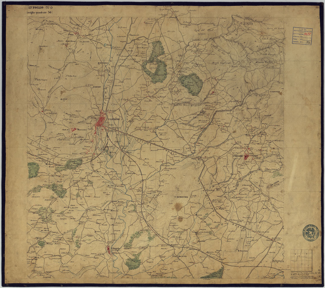 "Sono 167 tavolette montate su tela o seta, copiate e messe in netto all'Officio Topografico di Napoli su le levate eseguite dal 1834 al 1860 per la formazione della Carta del Reame di Napoli alla scala di 1:80.000. L'esecuzione di questa carta venne decretata nel 1814: essa fu però iniziata, dati i movimenti politici di quell'epoca, soltanto nel 1833. Queste tavolette si riferiscono ai fogli 1, 5, 8, 9, 12, 13, 17-19, 28, 29, 33 della suddetta carta la quale doveva essere disegnata ed incisa su rame a bulino in fogli rettangolari con orografia a tratteggio e curve di livello tracciate alla equidistanza di 10 passi (m. 18,52) o di 52 passi (m. 92,60). Di essa peraltro furono pubblicati solamente cinque fogli, cioè: Napoli, Caserta, Gaeta, Leonessa, Cittaducale, tra il 1861 e 1870. L'I.G.M. conserva i rami dei primi tre di questi fogli. La carta all'80.000, pregevolissima per valore artistico e scientifico, venne giudicata superiore alle altre produzioni cartografiche contemporanee non solo italiane, ma europee (cfr. Mori A., La cartografia ufficiale in Italia e l'I.G.M. 1922, pag.107). Le tavolette sono disegnate a colori rosso per gli abitati, azzurro per le acque, verde per le vegetazioni, nero per le curve di livello, rete stradale, toponomastica e il rimanente della planimetria. Rappresentano l'orografia con le curve di livello, sostituite al sistema di tratteggio fino allora seguito, parte tracciate direttamente dagli operatori, parte completate a tavolino in base ai dati raccolti. Le tavolette sono suddivise a gruppi in base al foglio della carta all'80.000 cui si riferiscono ciascun gruppo reca annesso i nomi degli operatori e il visto del topografo capo. Annesso un "Quadro d'unione delle levate alla scala di 1:20.000 eseguite fino a tutto il 1860 dal R. Officio Topografico Napoletano" alla scala di 1:490.700, stampato nel 1884. Il documento è ripartito in Cart. d'Arch. n°75 (che comprende 52 fogli), n° 76 (48 fogli), n° 77 (44 fogli)."
