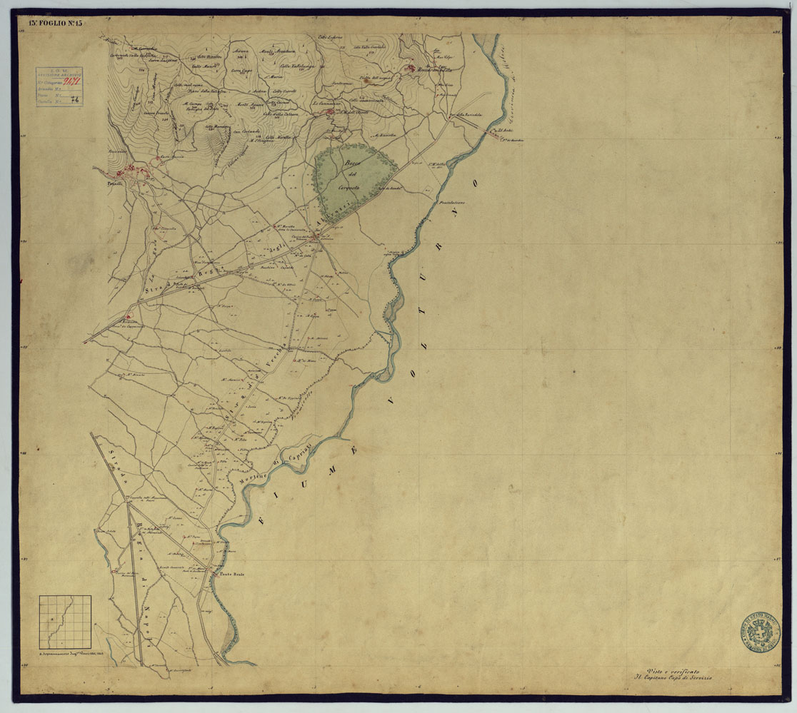 "Sono 167 tavolette montate su tela o seta, copiate e messe in netto all'Officio Topografico di Napoli su le levate eseguite dal 1834 al 1860 per la formazione della Carta del Reame di Napoli alla scala di 1:80.000. L'esecuzione di questa carta venne decretata nel 1814: essa fu però iniziata, dati i movimenti politici di quell'epoca, soltanto nel 1833. Queste tavolette si riferiscono ai fogli 1, 5, 8, 9, 12, 13, 17-19, 28, 29, 33 della suddetta carta la quale doveva essere disegnata ed incisa su rame a bulino in fogli rettangolari con orografia a tratteggio e curve di livello tracciate alla equidistanza di 10 passi (m. 18,52) o di 52 passi (m. 92,60). Di essa peraltro furono pubblicati solamente cinque fogli, cioè: Napoli, Caserta, Gaeta, Leonessa, Cittaducale, tra il 1861 e 1870. L'I.G.M. conserva i rami dei primi tre di questi fogli. La carta all'80.000, pregevolissima per valore artistico e scientifico, venne giudicata superiore alle altre produzioni cartografiche contemporanee non solo italiane, ma europee (cfr. Mori A., La cartografia ufficiale in Italia e l'I.G.M. 1922, pag.107). Le tavolette sono disegnate a colori rosso per gli abitati, azzurro per le acque, verde per le vegetazioni, nero per le curve di livello, rete stradale, toponomastica e il rimanente della planimetria. Rappresentano l'orografia con le curve di livello, sostituite al sistema di tratteggio fino allora seguito, parte tracciate direttamente dagli operatori, parte completate a tavolino in base ai dati raccolti. Le tavolette sono suddivise a gruppi in base al foglio della carta all'80.000 cui si riferiscono ciascun gruppo reca annesso i nomi degli operatori e il visto del topografo capo. Annesso un "Quadro d'unione delle levate alla scala di 1:20.000 eseguite fino a tutto il 1860 dal R. Officio Topografico Napoletano" alla scala di 1:490.700, stampato nel 1884. Il documento è ripartito in Cart. d'Arch. n°75 (che comprende 52 fogli), n° 76 (48 fogli), n° 77 (44 fogli)."