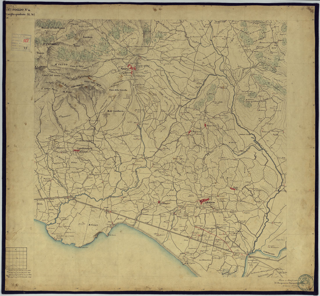 "Sono 167 tavolette montate su tela o seta, copiate e messe in netto all'Officio Topografico di Napoli su le levate eseguite dal 1834 al 1860 per la formazione della Carta del Reame di Napoli alla scala di 1:80.000. L'esecuzione di questa carta venne decretata nel 1814: essa fu però iniziata, dati i movimenti politici di quell'epoca, soltanto nel 1833. Queste tavolette si riferiscono ai fogli 1, 5, 8, 9, 12, 13, 17-19, 28, 29, 33 della suddetta carta la quale doveva essere disegnata ed incisa su rame a bulino in fogli rettangolari con orografia a tratteggio e curve di livello tracciate alla equidistanza di 10 passi (m. 18,52) o di 52 passi (m. 92,60). Di essa peraltro furono pubblicati solamente cinque fogli, cioè: Napoli, Caserta, Gaeta, Leonessa, Cittaducale, tra il 1861 e 1870. L'I.G.M. conserva i rami dei primi tre di questi fogli. La carta all'80.000, pregevolissima per valore artistico e scientifico, venne giudicata superiore alle altre produzioni cartografiche contemporanee non solo italiane, ma europee (cfr. Mori A., La cartografia ufficiale in Italia e l'I.G.M. 1922, pag.107). Le tavolette sono disegnate a colori rosso per gli abitati, azzurro per le acque, verde per le vegetazioni, nero per le curve di livello, rete stradale, toponomastica e il rimanente della planimetria. Rappresentano l'orografia con le curve di livello, sostituite al sistema di tratteggio fino allora seguito, parte tracciate direttamente dagli operatori, parte completate a tavolino in base ai dati raccolti. Le tavolette sono suddivise a gruppi in base al foglio della carta all'80.000 cui si riferiscono ciascun gruppo reca annesso i nomi degli operatori e il visto del topografo capo. Annesso un "Quadro d'unione delle levate alla scala di 1:20.000 eseguite fino a tutto il 1860 dal R. Officio Topografico Napoletano" alla scala di 1:490.700, stampato nel 1884. Il documento è ripartito in Cart. d'Arch. n°75 (che comprende 52 fogli), n° 76 (48 fogli), n° 77 (44 fogli)."